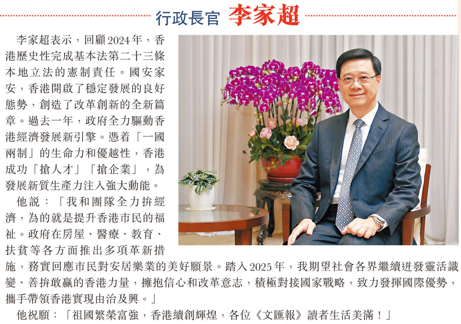 踏入2025年,特區政府會繼續發揮好「一國兩制」的獨特優勢,強化「內聯外通」,進一步提升「超級聯繫人」和「超級增值人」的角色和功能,加速融入國家發展大局,更主動對接國家發展戰略,銳意改革創新、搶抓機遇,為香港經濟、社會和民生各項事業全力打拚,也為國家的強國建設和民族復興偉業貢獻更多「香港力量」。