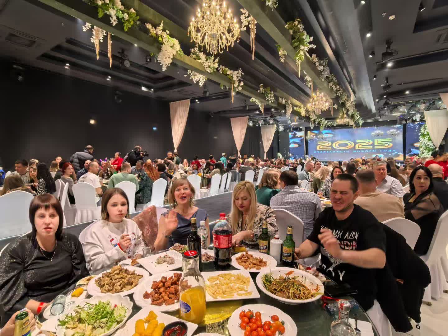 在琿春市的向日葵婚禮廳、華春上越樓等酒店內燈火輝煌,人聲鼎沸,到處洋溢着節日的喜慶氣氛。19時許參加中俄跨年狂歡晚會的俄羅斯遊客陸續走進大廳,在酒席間就座。許多俄羅斯家庭選擇全家總動員,一同來到琿春共度這個特別的新年。