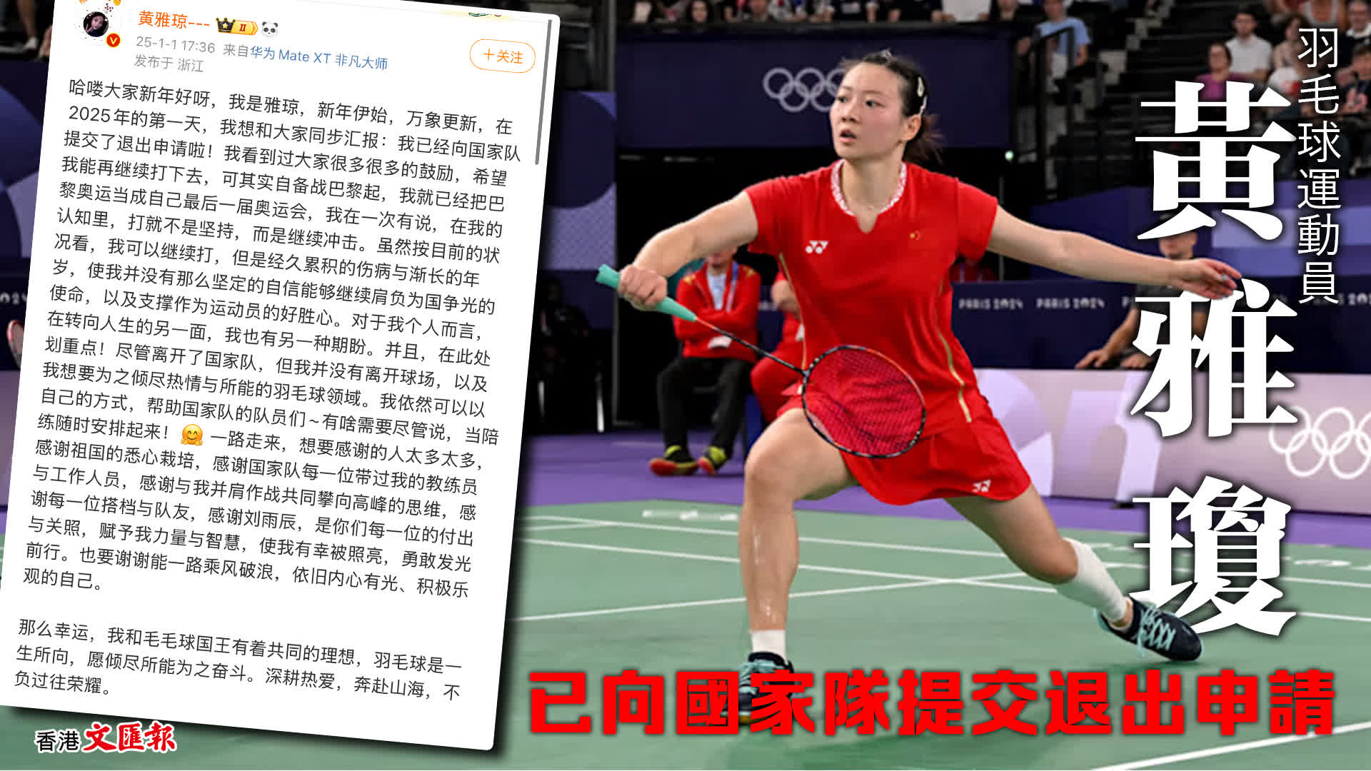 巴黎奧運羽毛球混雙金牌獲得者黃雅瓊,今日(1日)在微博發文稱,自己已經向國家隊提交退出申請。
