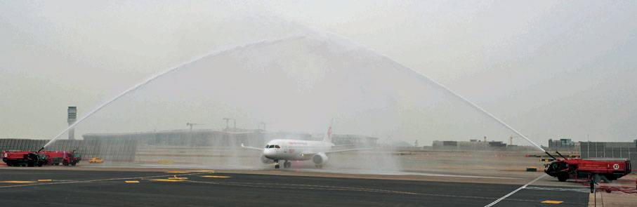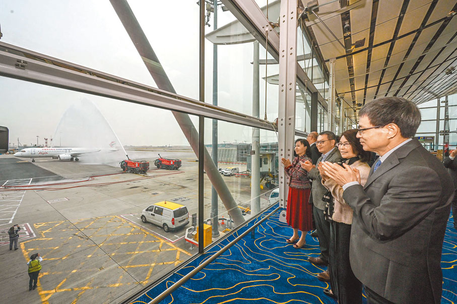 國產大型客機C919往返上海至香港的首航航班,昨日上午降落香港機場,香港國際機場以民航界最高禮儀過水門儀式迎接。航空公司為首航旅客送上特製登機牌和蛋糕,旅發局亦為旅客送上包括餅乾等手信,歡迎他們抵達香港。