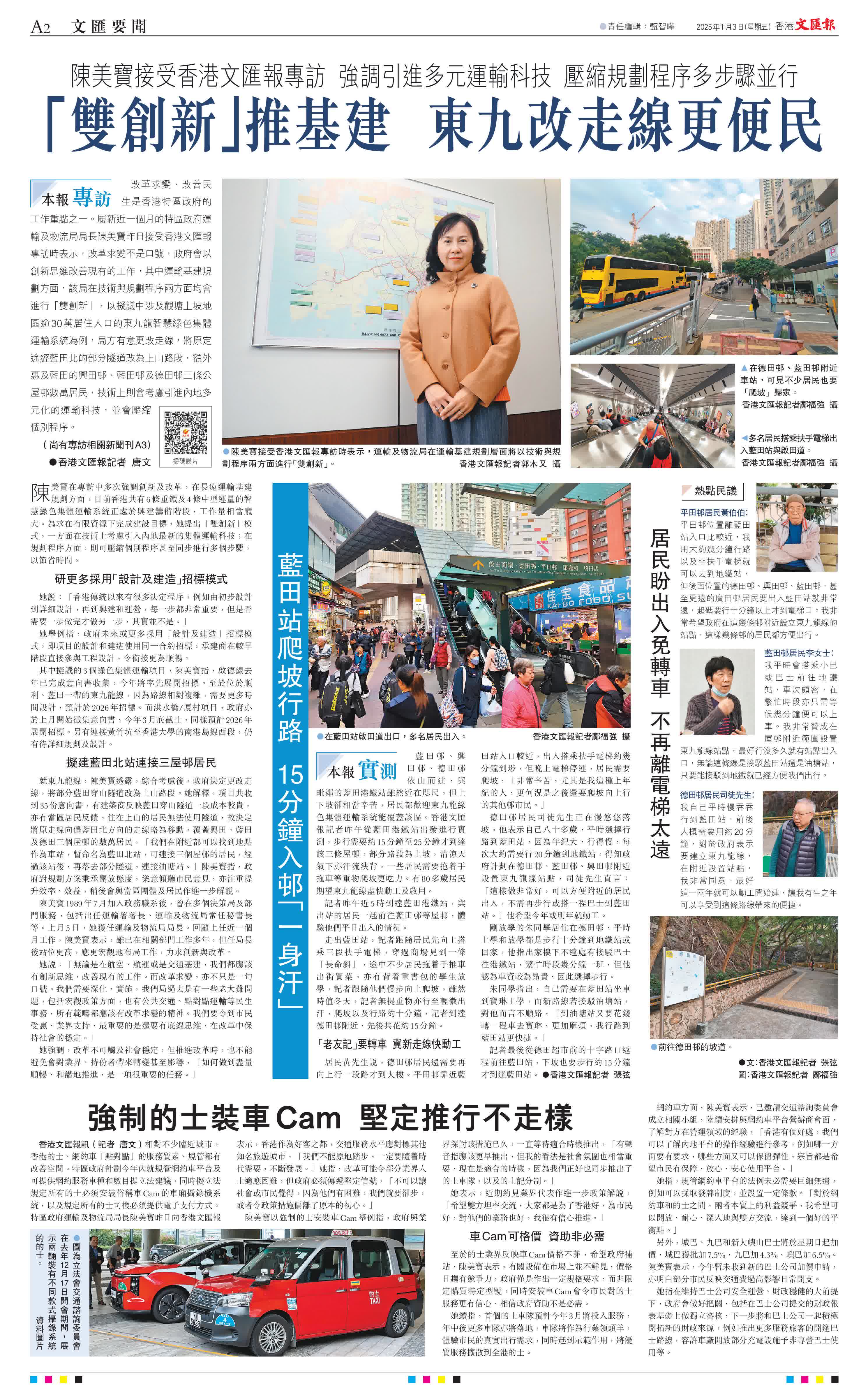 (記者 唐文)改革求變、改善民生是香港特區政府的工作重點之一。履新近一個月的特區政府運輸及物流局局長陳美寶昨日接受香港文匯報專訪時表示,改革求變不是口號,政府會以創新思維改善現有的工作,其中運輸基建規劃方面,該局在技術與規劃程序兩方面均會進行「雙創新」,以擬議中涉及觀塘上坡地區逾30萬居住人口的東九龍智慧綠色集體運輸系統為例,局方有意更改走線,將原定途經藍田北的部分隧道改為上山路段,額外惠及藍田的興田邨、藍田邨及德田邨三條公屋邨數萬居民,技術上則會考慮引進內地多元化的運輸科技,並會壓縮個別程序。