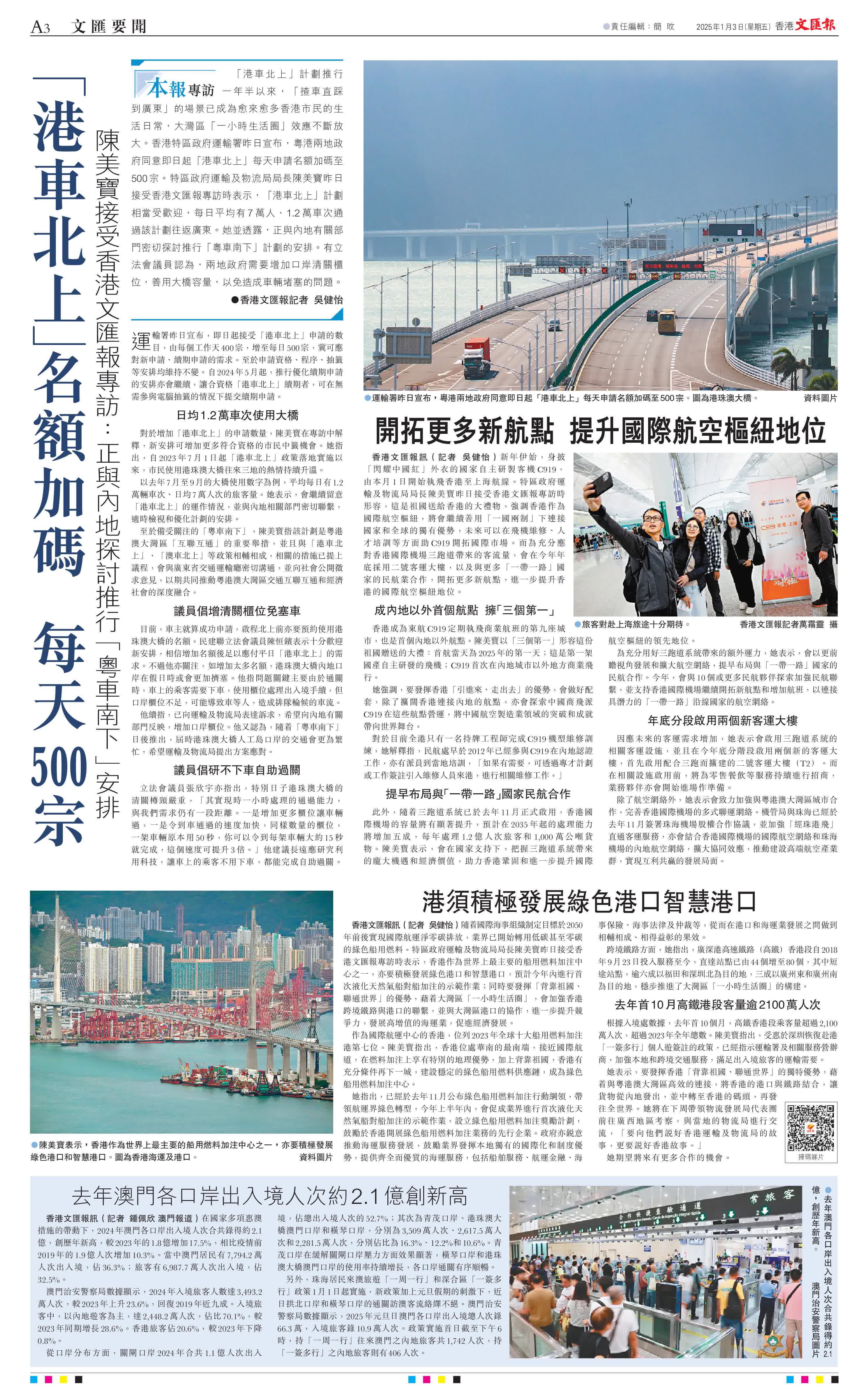 (香港文匯報記者 吳健怡)「港車北上」計劃推行一年半以來,「揸車直踩到廣東」的場景已成為愈來愈多香港市民的生活日常,大灣區「一小時生活圈」效應不斷放大。香港特區政府運輸署昨日宣布,粵港兩地政府同意即日起「港車北上」每天申請名額加碼至500宗。特區政府運輸及物流局局長陳美寶昨日接受香港文匯報專訪時表示,「港車北上」計劃相當受歡迎,每日平均有7萬人、1.2萬車次通過該計劃往返廣東。她並透露,正與內地有關部門密切探討推行「粵車南下」計劃的安排。有立法會議員認為,兩地政府需要增加口岸清關櫃位,善用大橋容量,以免造成車輛堵塞的問題。