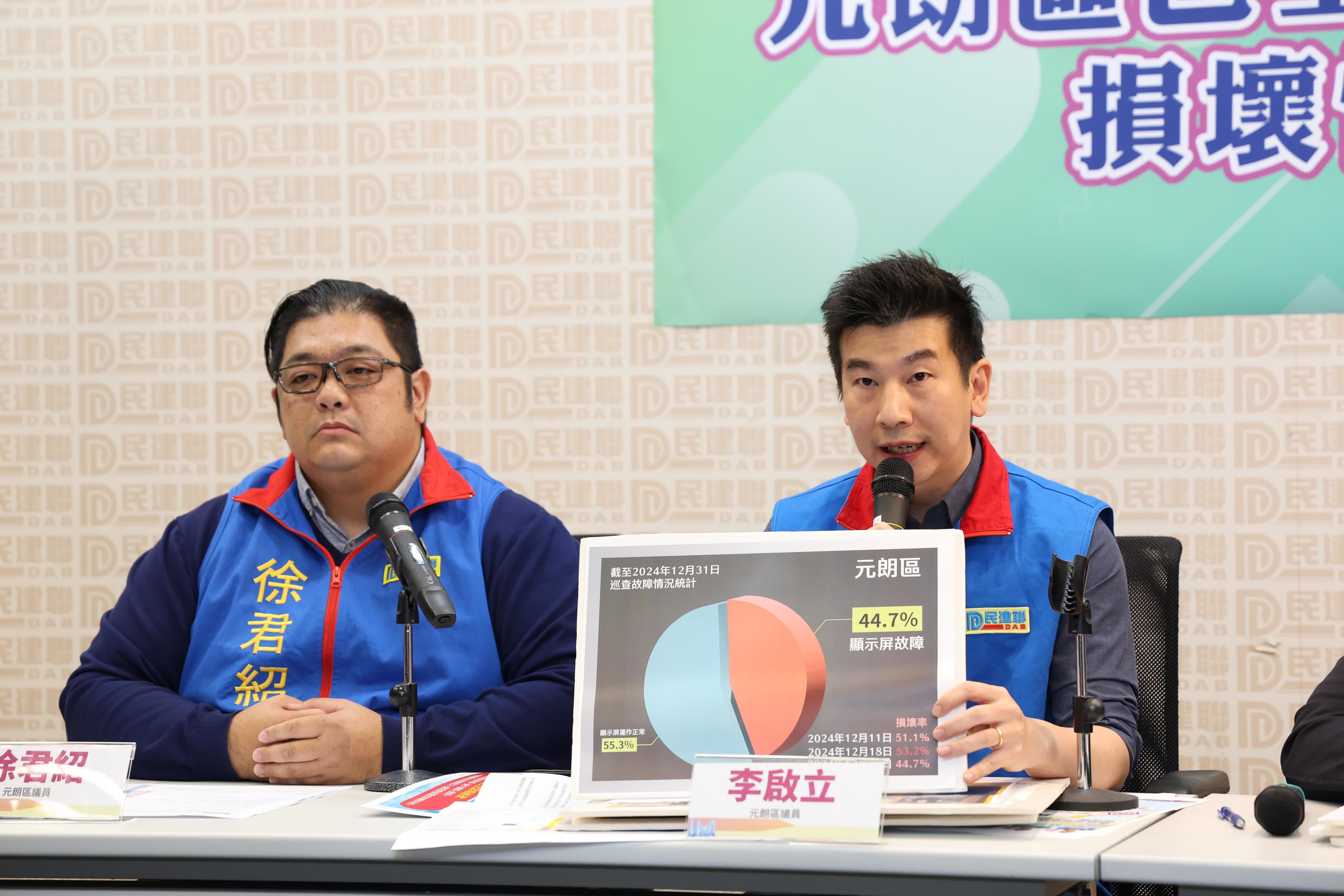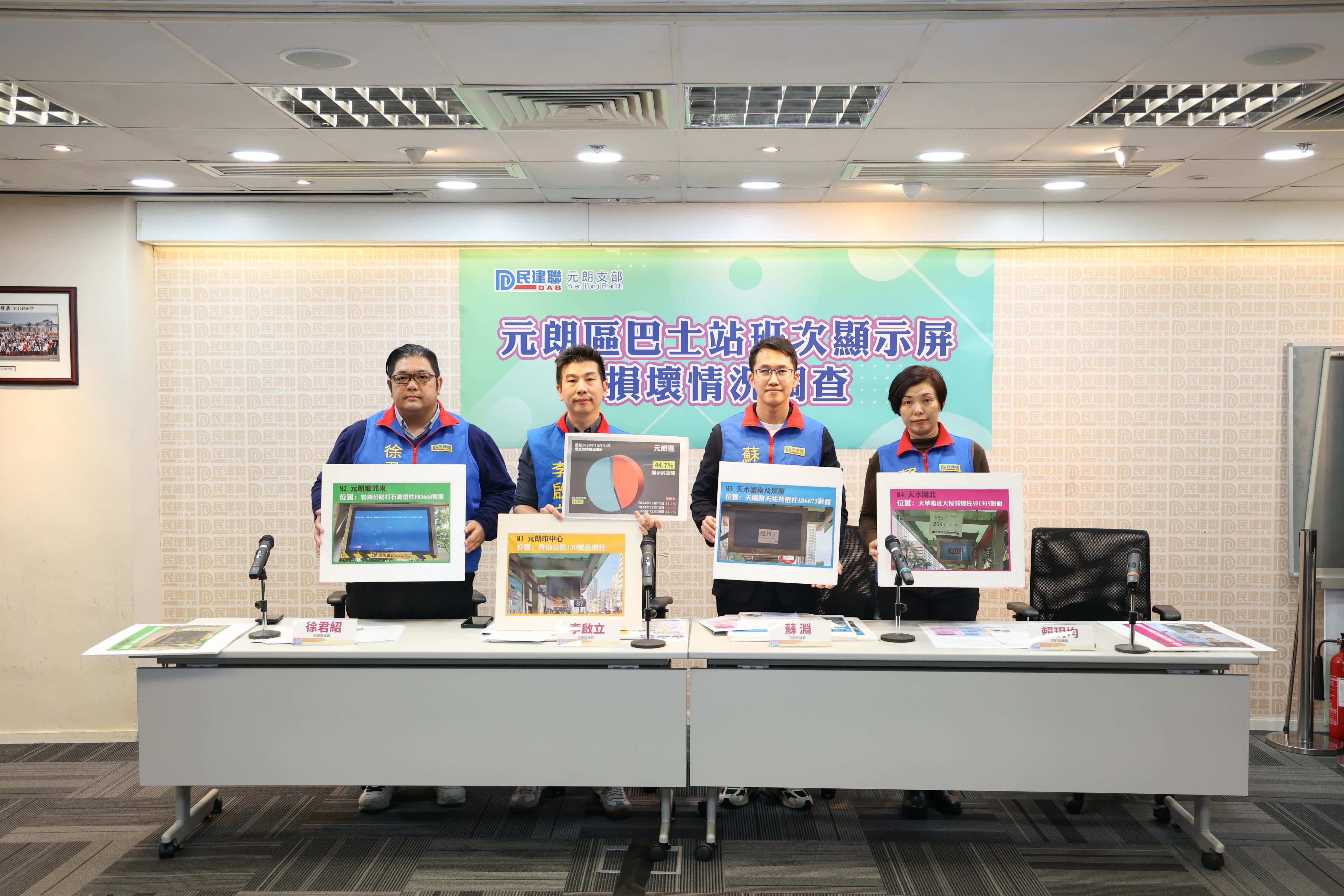 民建聯元朗支部於去年12月11日、18日、及28至31日,分三次巡查區內47個已加裝顯示屏巴士站,發現元朗市中心的4個顯示屏有3個一直未能維修;元朗鄉郊東的17個顯示屏在三次巡查中,分別發現有10至12個損毀;天水圍南及屏廈的16個顯示屏,分別有3至4個損毀;天水圍北10個顯示屏,分別有3至7個損毀。三次巡查結果顯示,全區巴士站顯示屏損毀率分別為51.1%、53.2%、及44.7%。