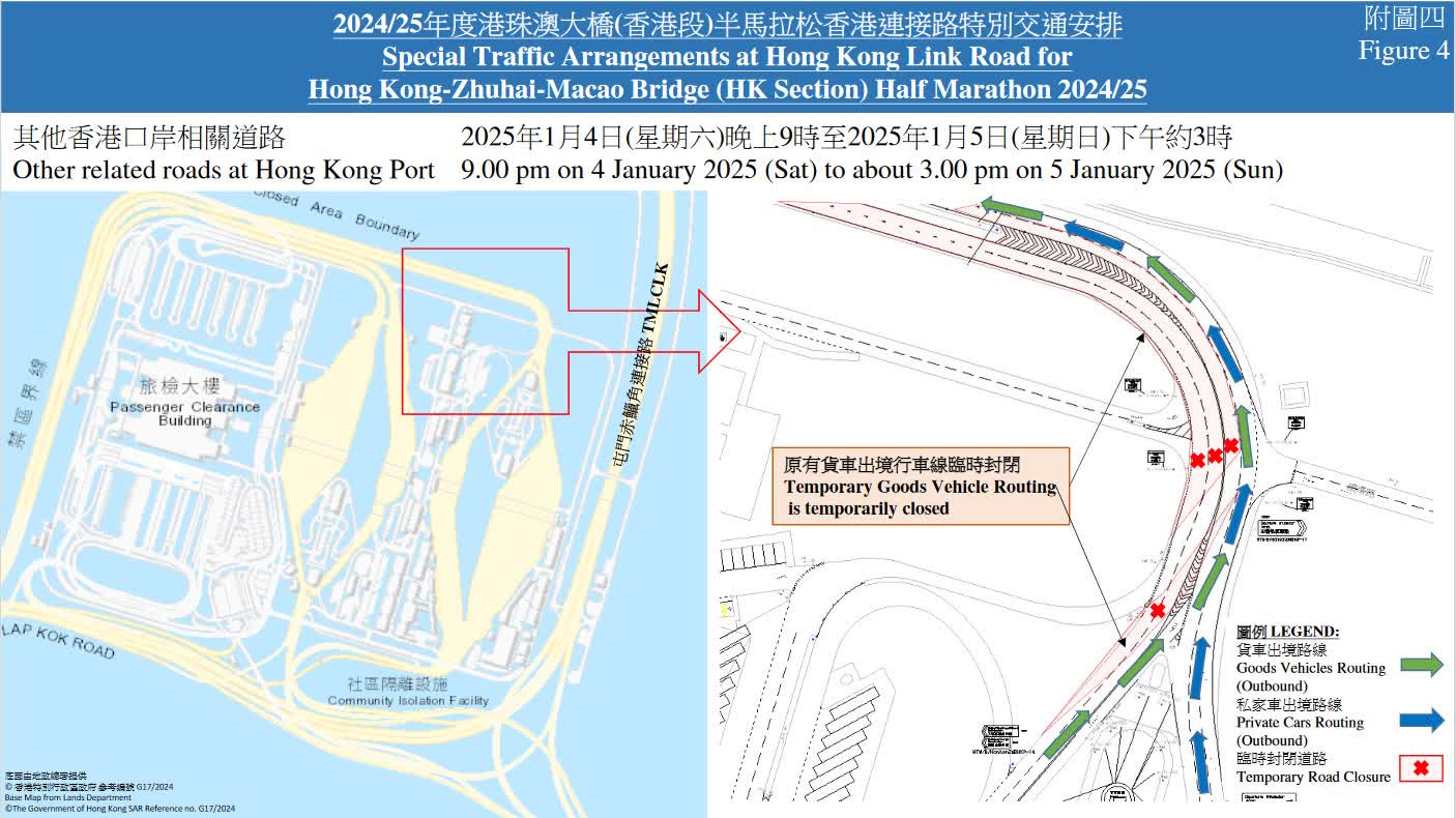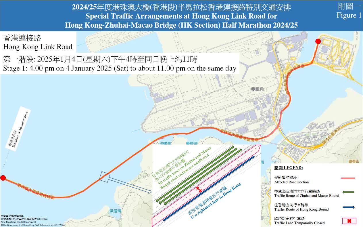 2024/2025港珠澳大橋(香港段)半馬拉松將於周日(5日)舉行。田總今年力邀來自各東亞國家及地區的精英跑手來港參賽,包括有肯亞(Kenya)及埃塞俄比亞(Ethiopia)高手,與約8,000名香港選手同場競技,力爭佳績。跑手可踏足「港珠澳大橋」香港段,在比賽之餘同時可欣賞香港美麗景觀,以及感受大橋的獨有魅力。警方於明天及周日(5日)會實施特別交通安排,以配合比賽進行。大橋香港連接路由周六下午4時起,分三個階段封路,直到周日(1月5日)下午約4時30分解封。駕駛人士要注意啦!