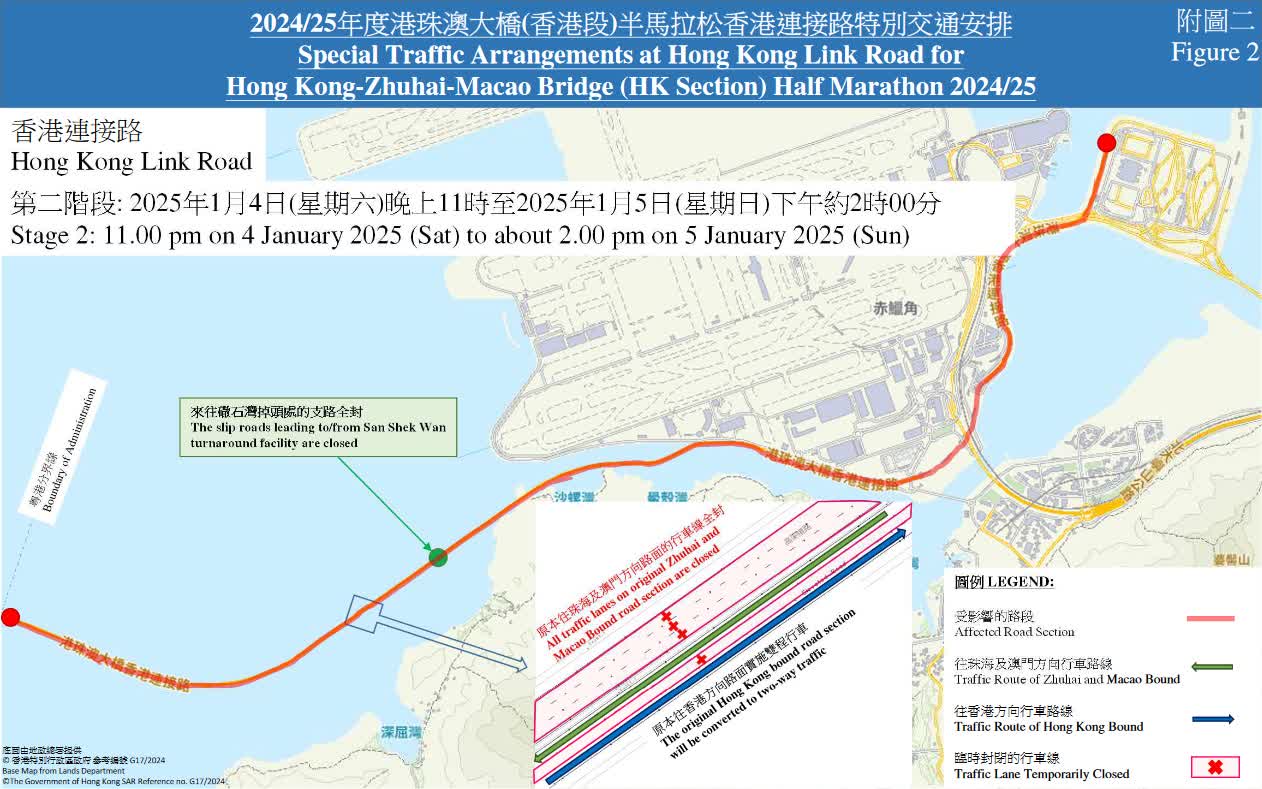 第二階段(1月4日晚上約11時至1月五日下午約2時)上述路段(往珠海及澳門方向)全部行車線、上述路段(往香港方向)的中線,以及來往䃟石灣掉頭處的支路將會封閉。