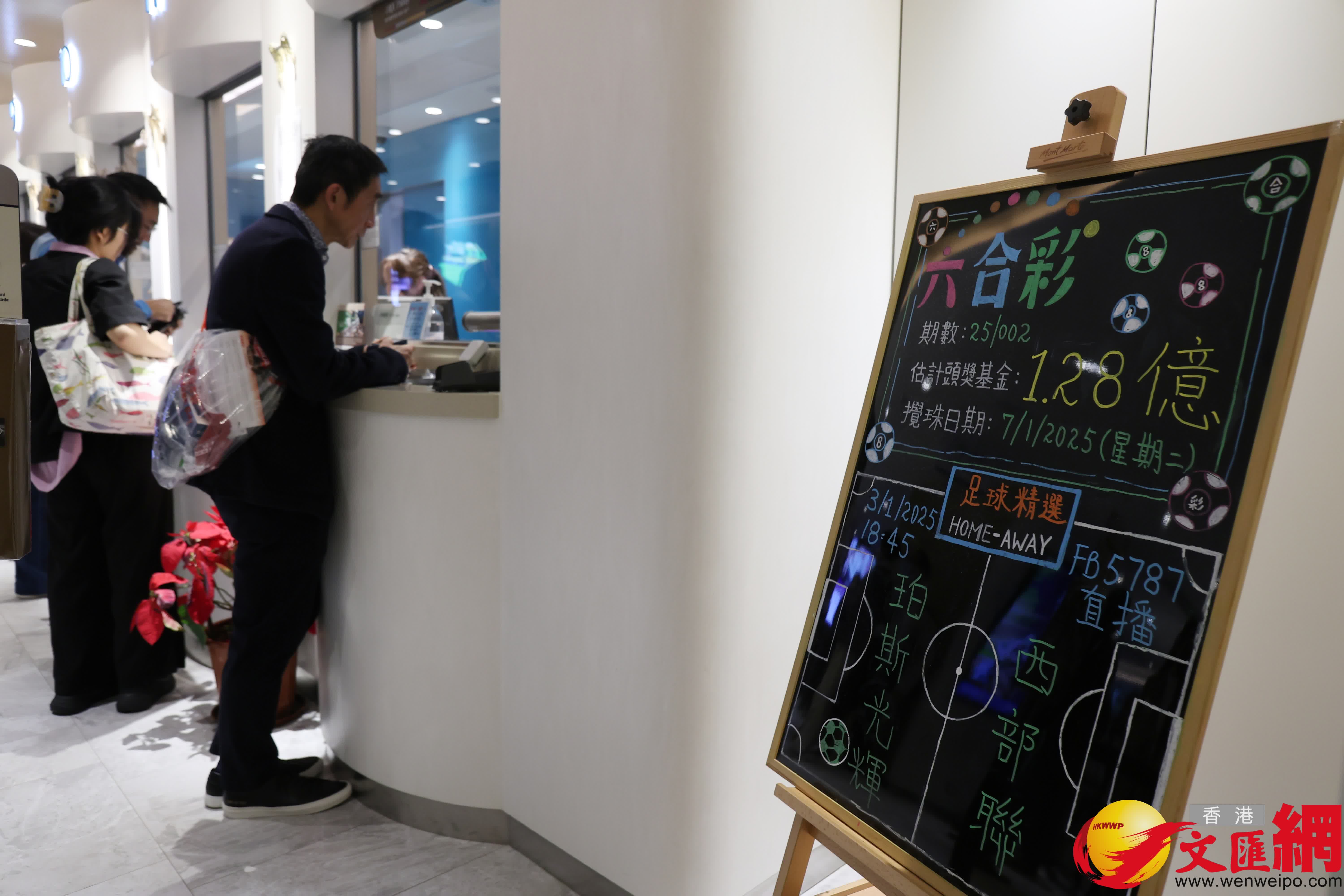 香港文匯報訊(記者 唐文)香港文匯報記者今日下午在中環士丹利街投注站觀察,鄰近5時現場近百人正排隊買飛,由於上一期無人中獎,導致獎池突然變化,該投注站尚未來得及製作宣傳海報,僅用手寫版強調1.28億巨額獎金。