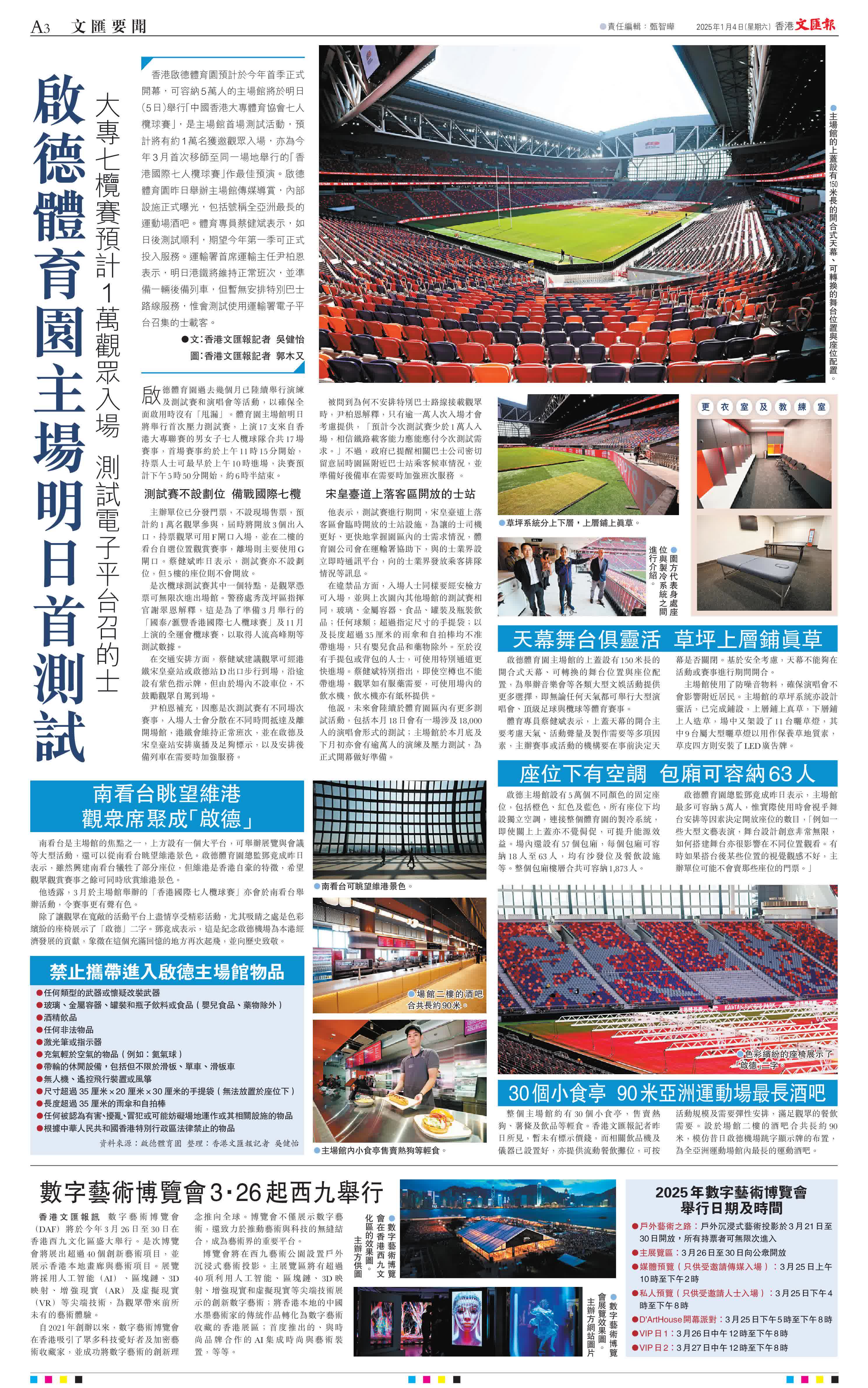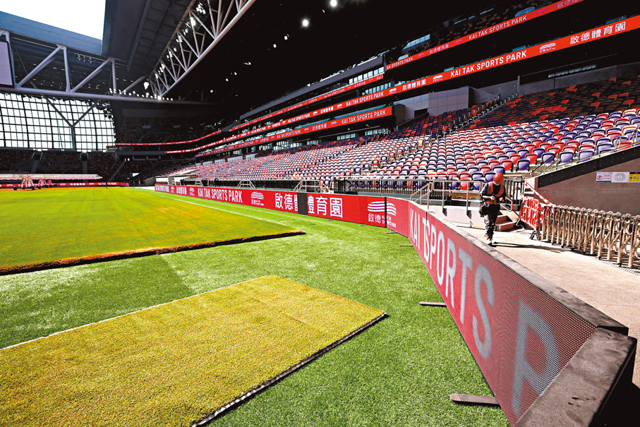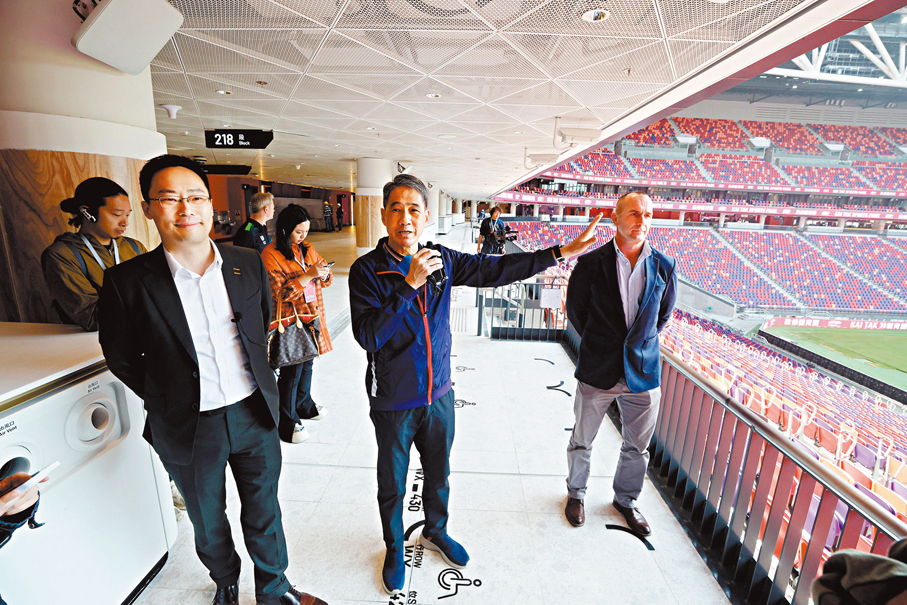 (文:香港文匯報記者 吳健怡 圖:香港文匯報記者 郭木又)香港啟德體育園預計於今年首季正式開幕,可容納5萬人的主場館將於明日(5日)舉行「中國香港大專體育協會七人欖球賽」,是主場館首場測試活動,預計將有約1萬名獲邀觀眾入場,亦為今年3月首次移師至同一場地舉行的「香港國際七人欖球賽」作最佳預演。啟德體育園昨日舉辦主場館傳媒導賞,內部設施正式曝光,包括號稱全亞洲最長的運動場酒吧。體育專員蔡健斌表示,如日後測試順利,期望今年第一季可正式投入服務。運輸署首席運輸主任尹柏恩表示,明日港鐵將維持正常班次,並準備一輛後備列車,但暫無安排特別巴士路線服務,惟會測試使用運輸署電子平台召集的士載客。