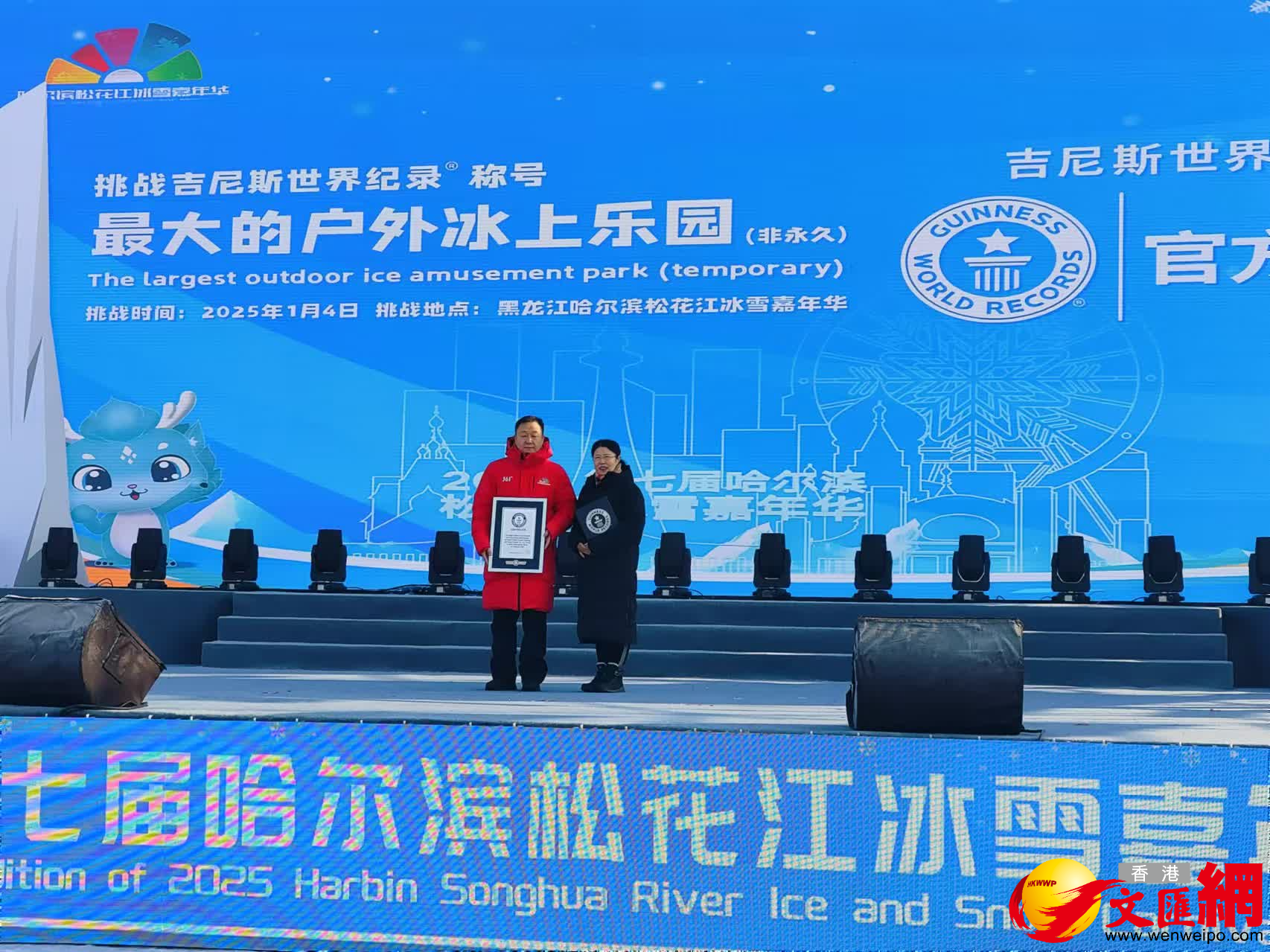 (香港文匯網記者王欣欣 哈爾濱報道)1月4日,2025第七屆哈爾濱松花江冰雪嘉年華正式開園迎客,同時挑戰《最大的戶外冰上樂園》吉尼斯世界紀錄稱號成功,當日舉辦授牌儀式。