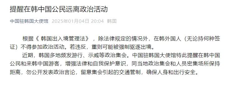 近期,韓國多地頻發遊行、示威等政治集會。中國駐韓國大使館特此提醒在韓中國公民和來韓中國遊客,增強法律和自我保護意識,同當地政治集會和人員密集場所保持距離,勿公開發表政治言論,留意集會引起的交通管制,確保人身和出行安全。