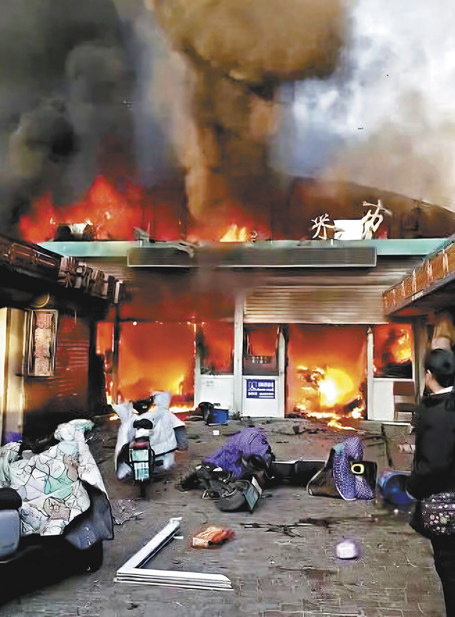 根據現場視頻顯示,菜市場內部燃起熊熊大火,火光從菜市場的鐵皮屋往外冒,現場產生了大量濃煙,從外部只能看到菜市場上空被黑煙籠罩。現場火勢兇猛且濃煙滾滾,消防員們在濃煙中展開有序的救援行動。有目擊者回憶稱,「當時裏面還點着燈籠和天然氣,突然『嘭』的一聲發生了爆炸,我能活着出來就不錯了。」從明火被撲滅後的現場視頻中可以看到,菜市場的招牌被燒得扭曲變形。現場貨架和貨物幾乎化為烏有,只剩下一片焦土和灰燼。目擊者在視頻中稱,「全燒成廢鐵了,周圍居民家的玻璃都燒裂了,全炸了。」