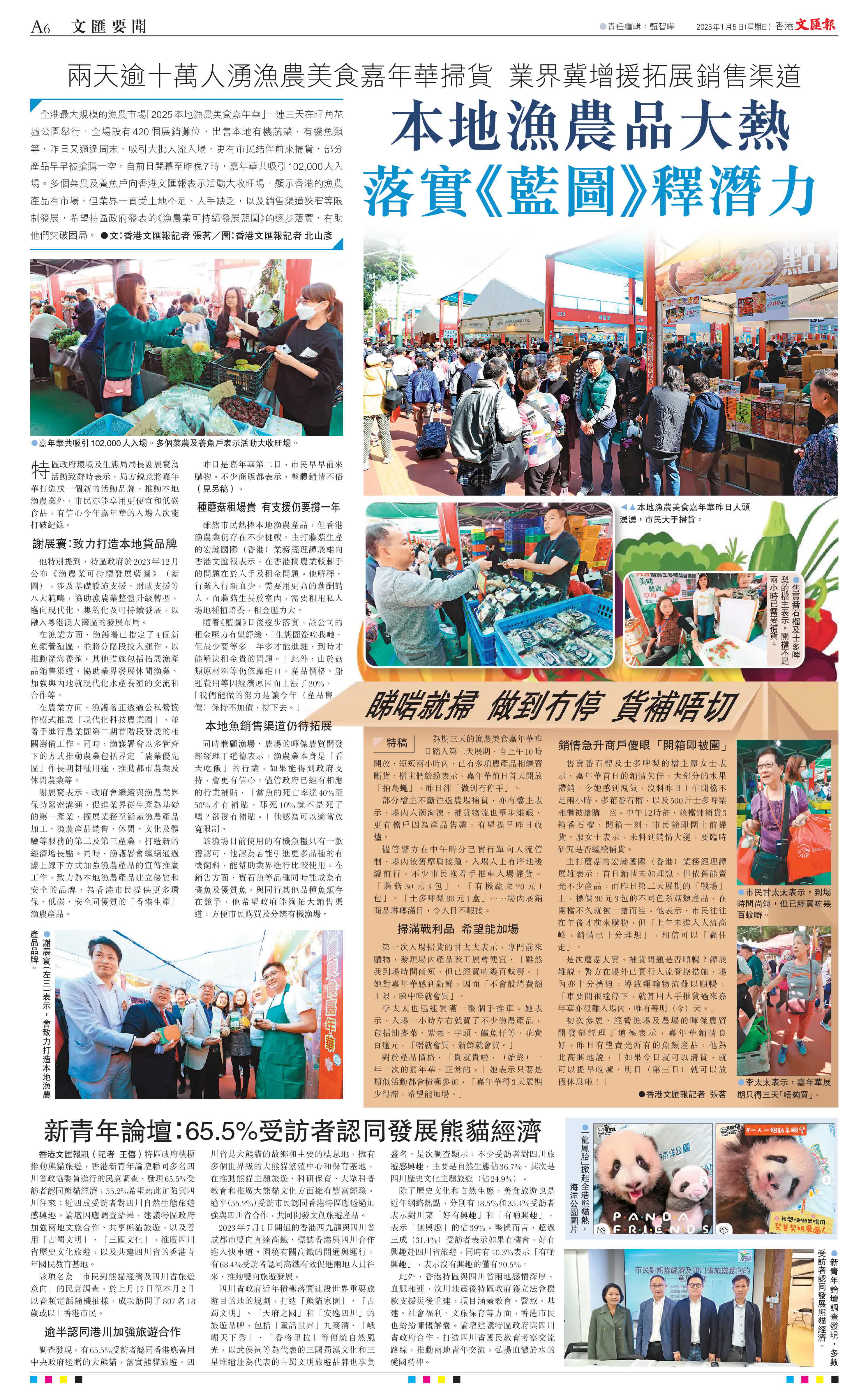 (香港文匯報記者 張茗/圖:香港文匯報記者 北山彥)全港最大規模的漁農市場「2025本地漁農美食嘉年華」一連三天在旺角花墟公園舉行,全場設有420個展銷攤位,出售本地有機蔬菜、有機魚類等,昨日又適逢周末,吸引大批人流入場,更有市民結伴前來掃貨,部分產品早早被搶購一空。自前日開幕至昨晚7時,嘉年華共吸引102,000人入場。多個菜農及養魚戶向香港文匯報表示活動大收旺場,顯示香港的漁農產品有市場,但業界一直受土地不足、人手缺乏,以及銷售渠道狹窄等限制發展,希望特區政府發表的《漁農業可持續發展藍圖》的逐步落實,有助他們突破困局。