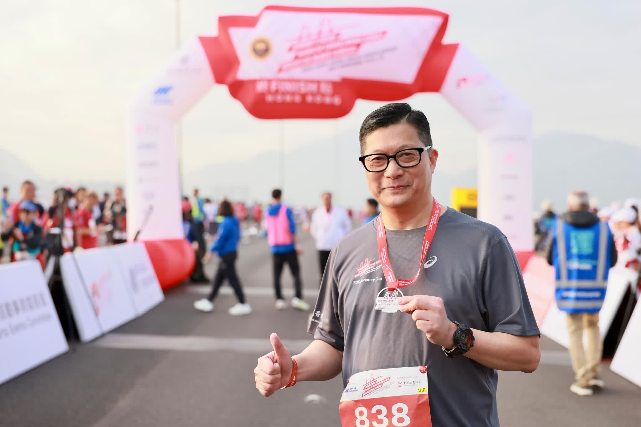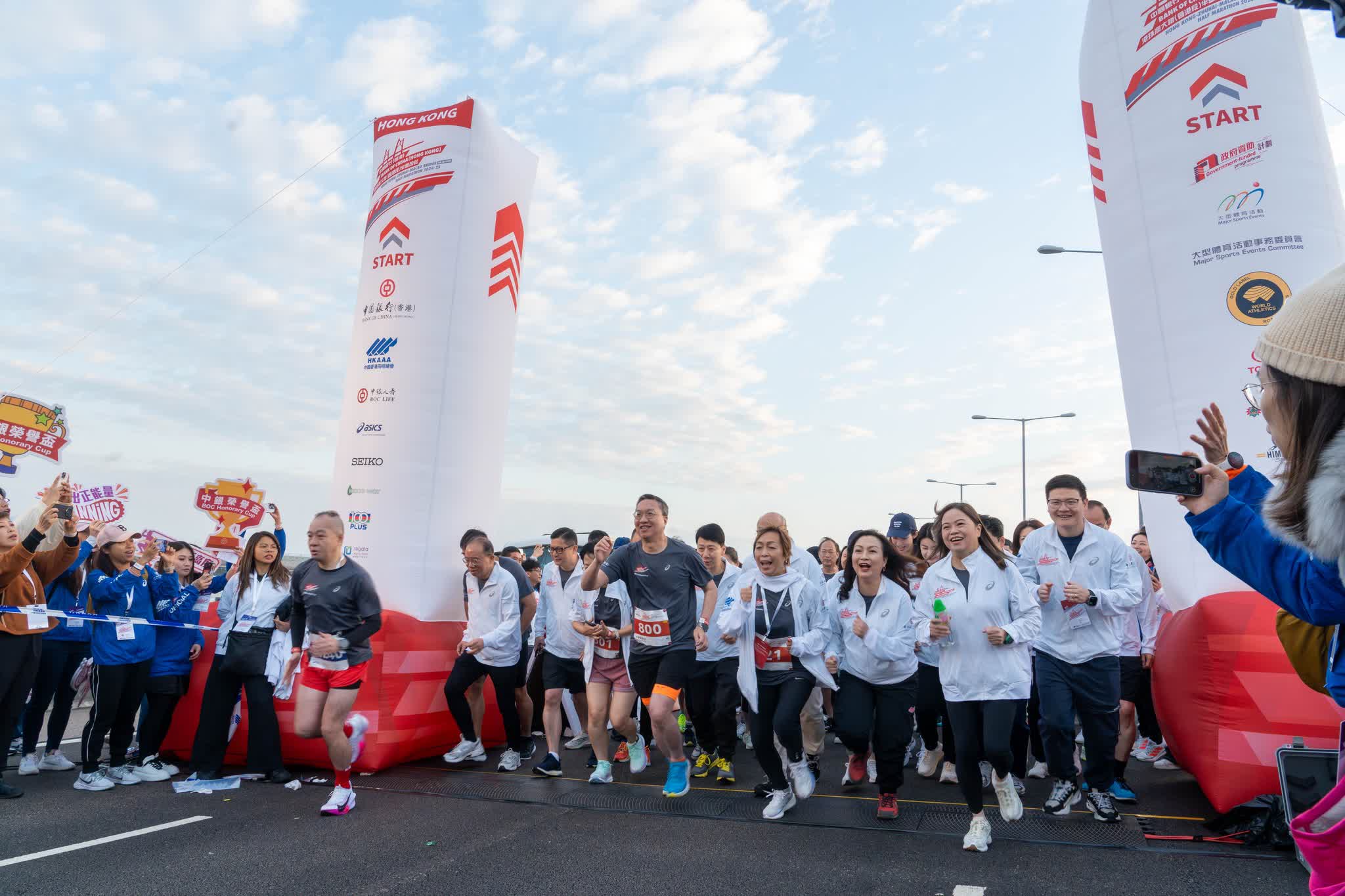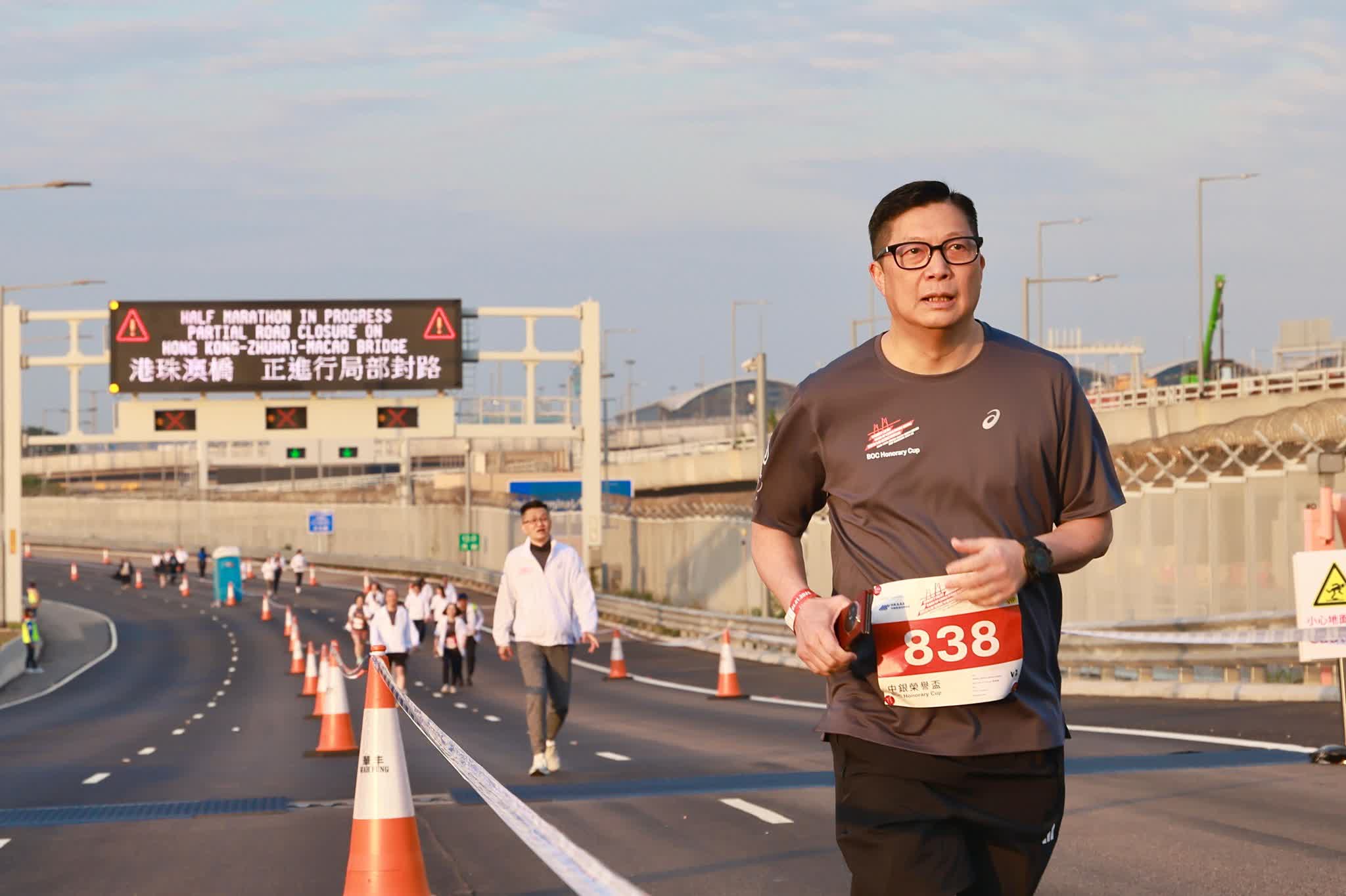 大公文匯全媒體報道:第二屆港珠澳大橋半馬拉松今早(5日)舉行,今次賽事除約8000名跑手參加挑戰組外,亦吸引多名高官及社會賢達參加「中銀港珠澳2公里榮譽盃」,包括律政司司長林定國、政制及內地事務局局長曾國衞、保安局局長鄧炳強,以及立法會議員鄭泳舜、霍啟剛夫婦、「微笑劍后」江旻憓等,文化體育及旅遊局局長羅淑佩主持完起跑儀式後亦有落場。