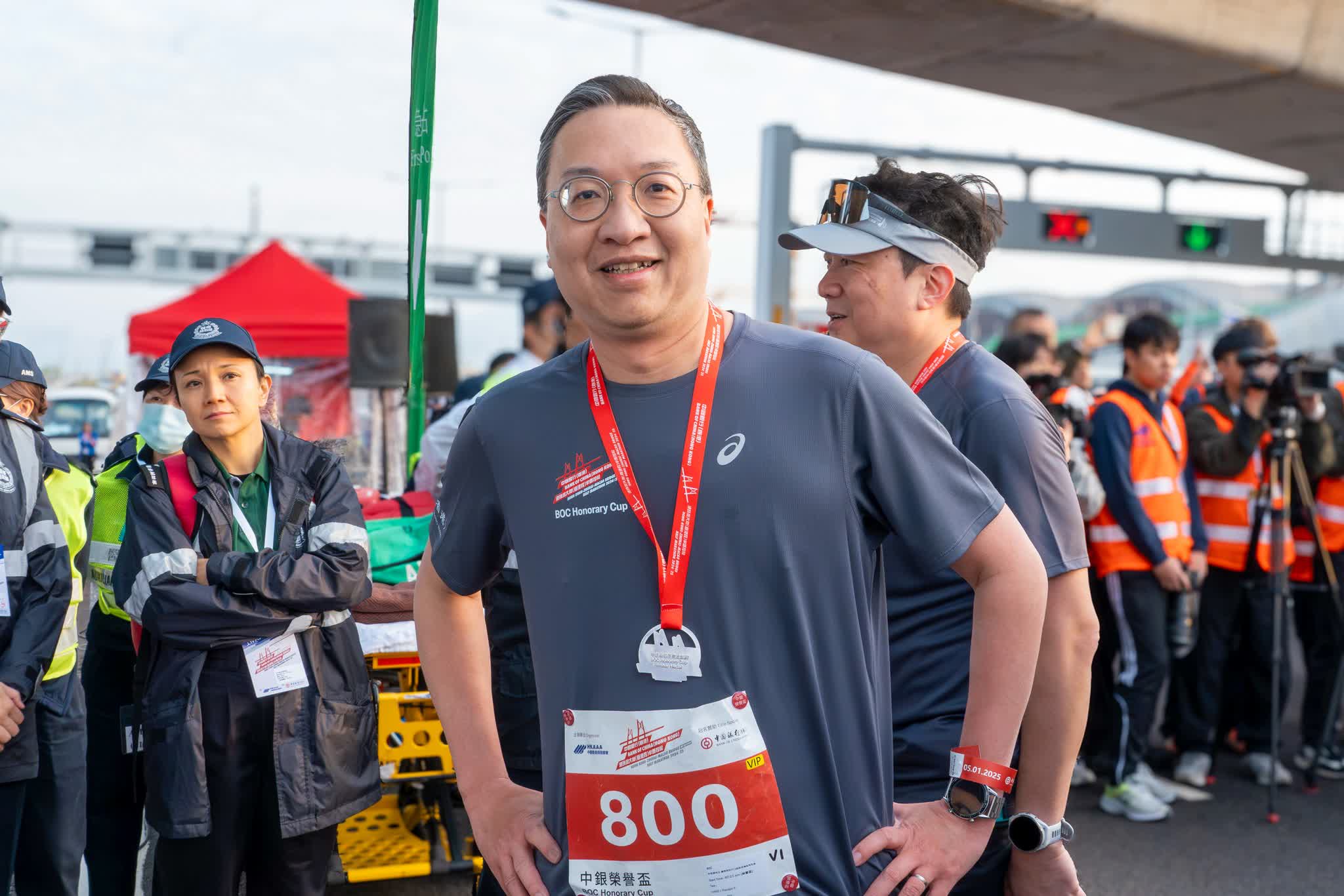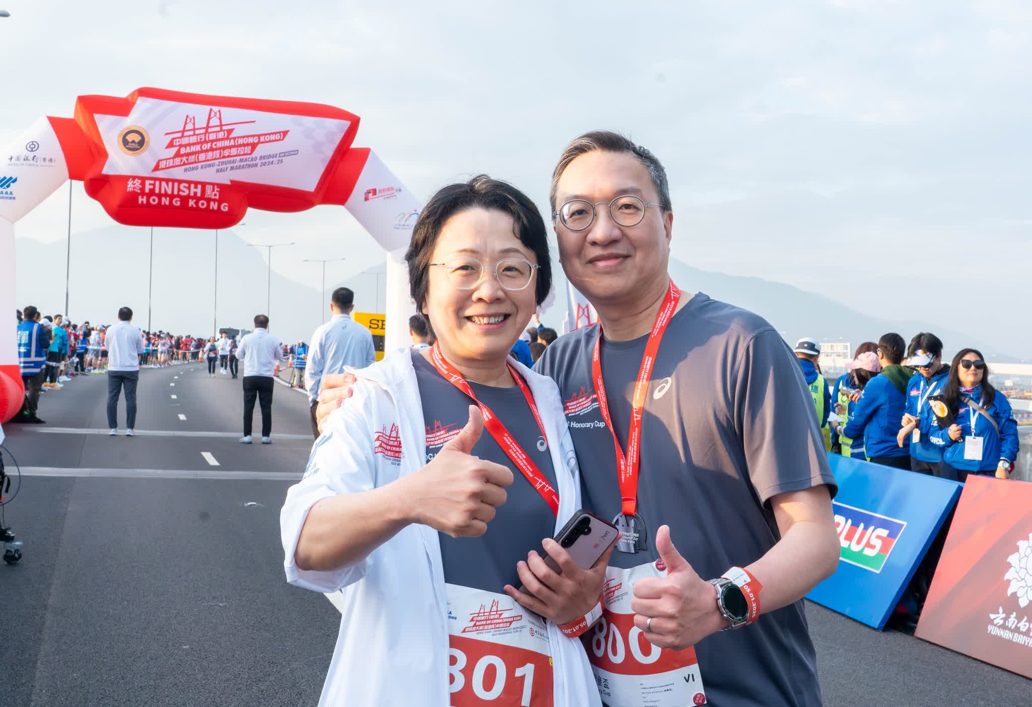 律政司司長林定國在社交平台發文透露,今早5時便同太太袁淑明起床出發參加「中銀港珠澳2公里榮譽盃」,又指今次是兩人首次在港珠澳大橋上與各方好友及市民大眾一同跑步,形容「感覺十分正」。他表示,今次活動充分顯示香港人的正能量,也充分體現香港巧妙運用獨一無二環境舉辦國際體育盛事的能力。他亦祝各位市民新年快樂,大家繼續勇往直前。