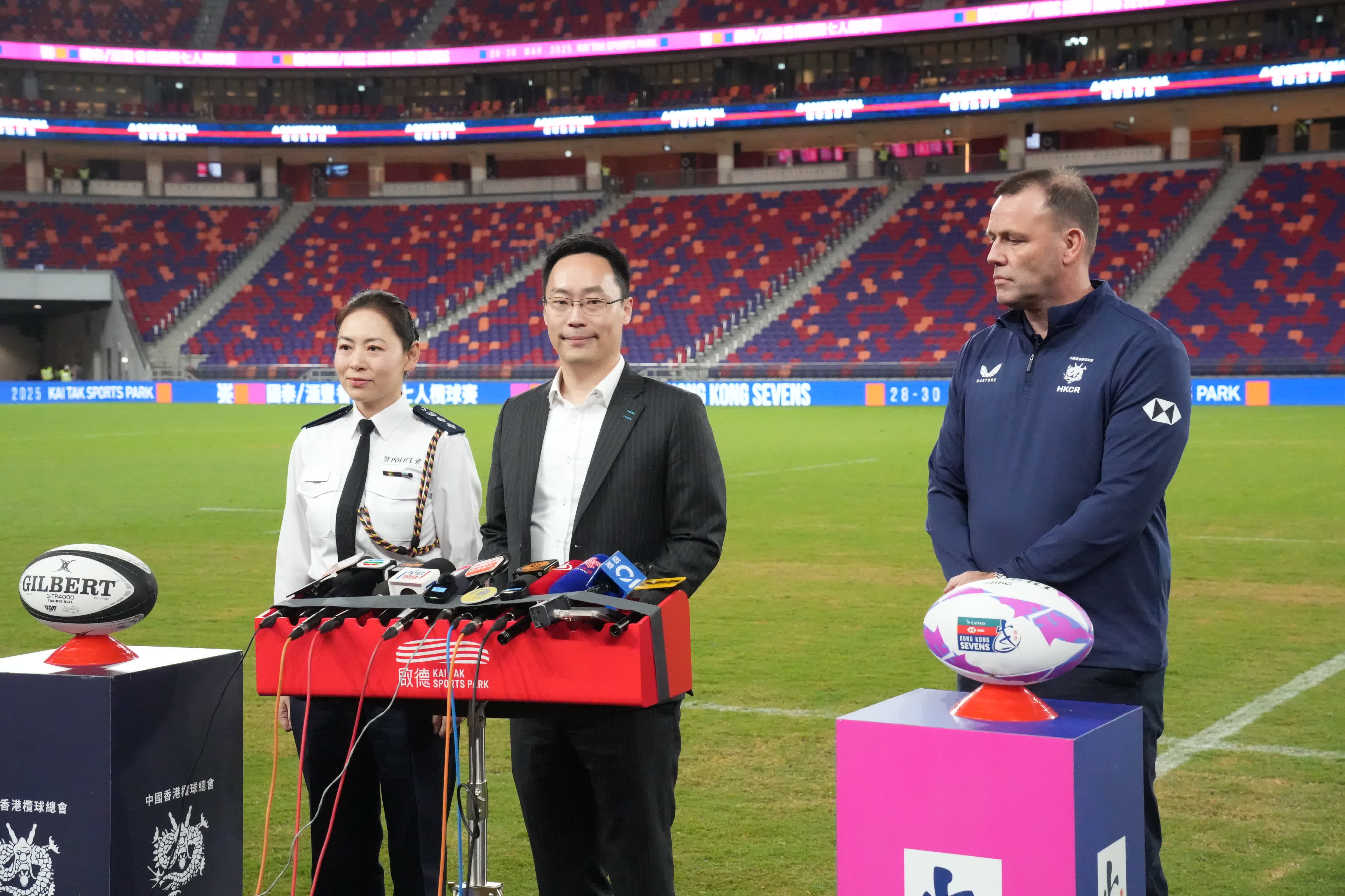 被問到今日有無觀眾穿着奇裝異服進場,以及日後舉行國際7人欖球賽時,手持打氣棒等能否進場。蔡健斌說,今日見不到有人穿着特別服飾而不能入場,場館禁止攜帶超過35厘米長的物品,包括雨傘進場,至於能否帶打氣捧要視乎長度。