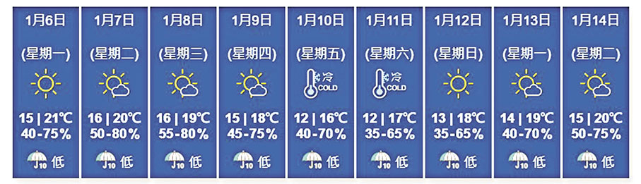 根據天文台九天天氣預報,今日(6日)最低氣溫只有15度,相比昨日最高氣溫下跌7度,而最高氣溫約21度,大致天晴及乾燥,早上清涼。預料周二(7日)晚上漸轉多雲及有一兩陣微雨,翌日(8日)初時仍有一兩陣微雨;周五(10日)天氣將會轉冷,氣溫介乎12度至16度,料天文台屆時需發出寒冷天氣警告;至下周日(12日)起一連三天,氣溫才會逐步回升,但早晚仍清涼,介乎攝氏13度至20度。