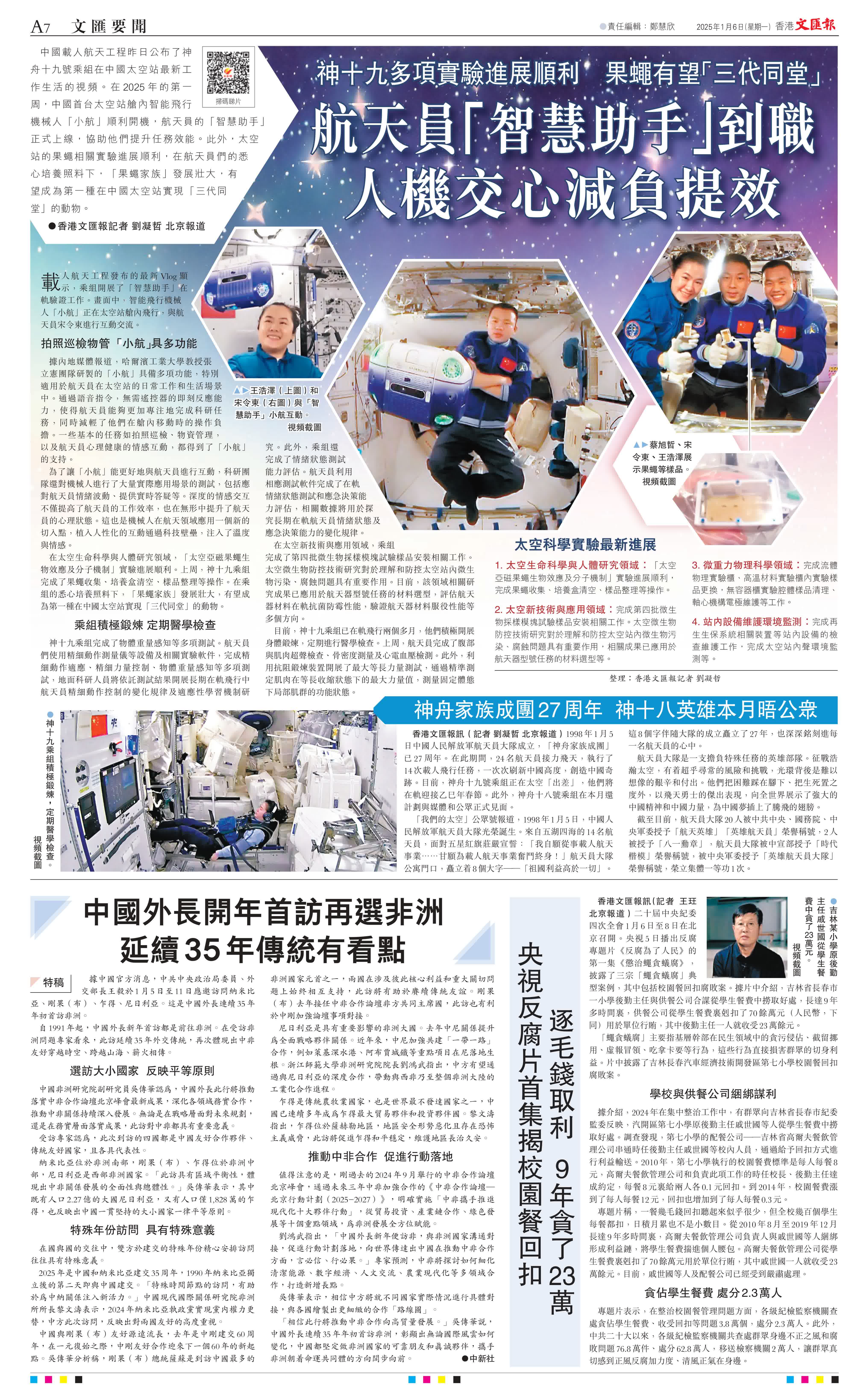 (香港文匯報記者 劉凝哲 北京報道)中國載人航天工程昨日公布了神舟十九號乘組在中國太空站最新工作生活的視頻。在2025年的第一周,中國首台太空站艙內智能飛行機械人「小航」順利開機,航天員的「智慧助手」正式上線,協助他們提升任務效能。此外,太空站的果蠅相關實驗進展順利,在航天員們的悉心培養照料下,「果蠅家族」發展壯大,有望成為第一種在中國太空站實現「三代同堂」的動物。