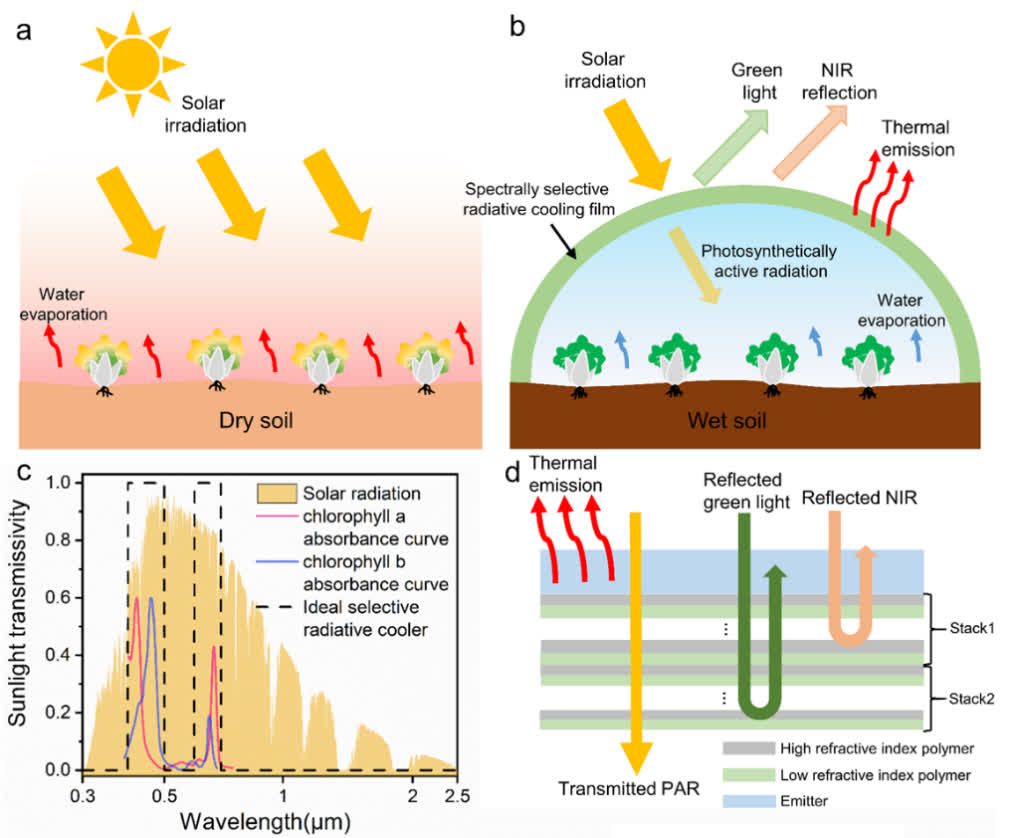 據中國科大研究人員介紹,PMF-RC膜由兩個不同的聚合物多層膜系和一種透明聚合物輻射製冷材料組成,可選擇性地透過用於農作物生長的光合有效輻射,反射植物葉片利用率較低的綠光和近紅外光,並具有優異的輻射製冷性能,實現了零能耗降低空氣溫度、土壤溫度和土壤水分蒸發量,並顯著提升了高溫環境下作物的產量。