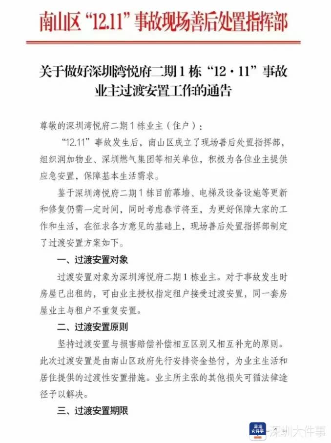 今天(1月6日),一份名為《關於做好深圳灣悅府二期1棟「12·11」事故業主過渡安置工作的通告》的文件截圖在網絡傳播,文件抬頭為「南山區『12.11』事故現場善後處置指揮部」。