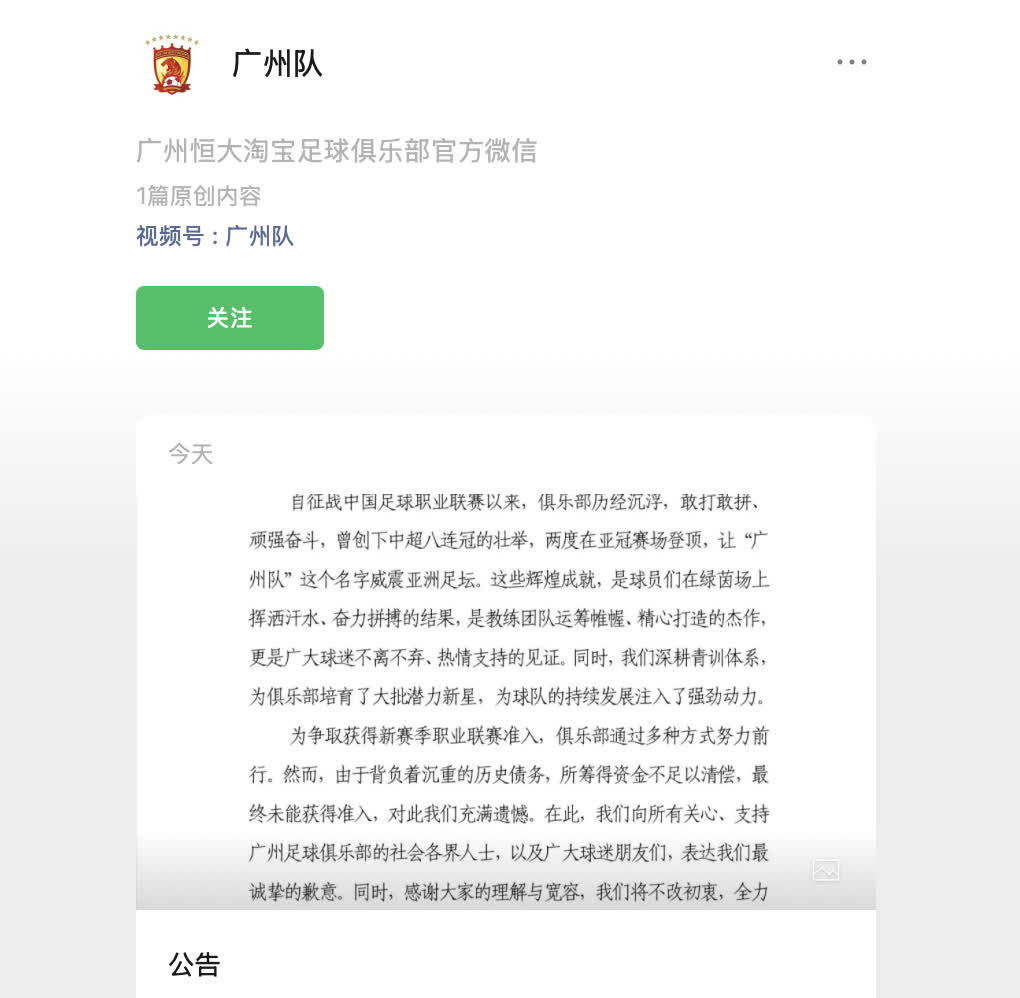 今日(6日),廣州恒大淘寶足球俱樂部微信公眾號發布公告指,「根據中國足球協會發布的 2025 賽季職業足球俱樂部准入名單,我俱樂部未獲准入,無法繼續征戰中國足球職業聯賽。」以下為公告全文: