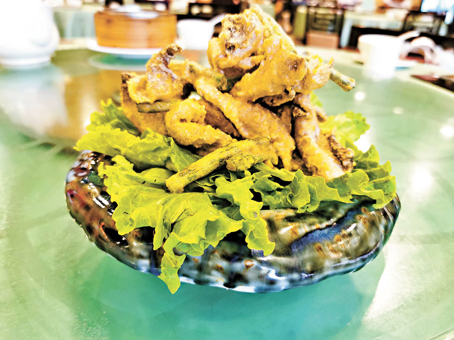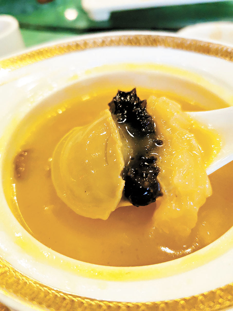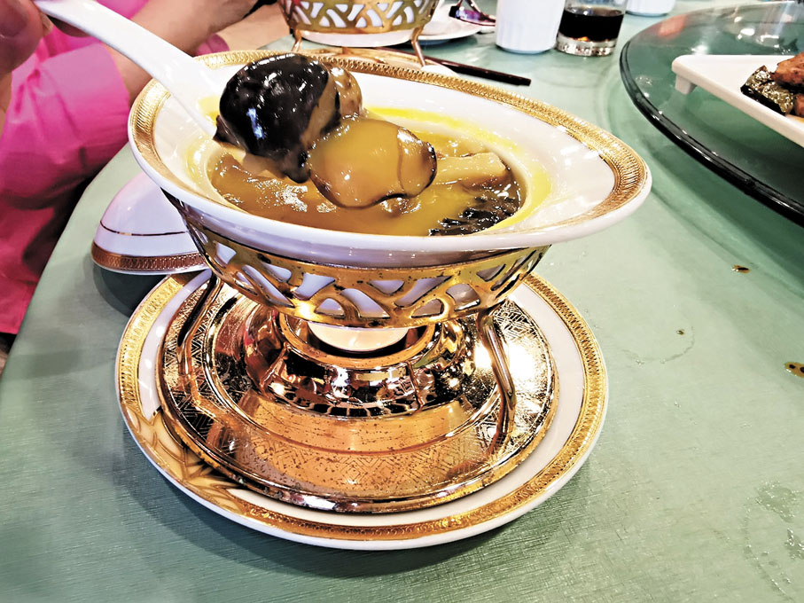 楊太親自介紹其他的菜式,首先,黃金甲(脆炸魚皮),魚皮非常爽脆,鹹蛋黃的香味讓人停不下來。至尊佛跳牆,用南瓜煮成金湯底,內有花膠、海參、瑤柱和冬菇,鮮甜滋補。意頭菜「得心應手鮑有餘」,由中南海師傅親手製作,選用泰國雞蛋殼和錦田農場初生雞蛋蛋白,蒸出特別嫩滑的蛋白,上桌時再放上鮑魚,創意十足。