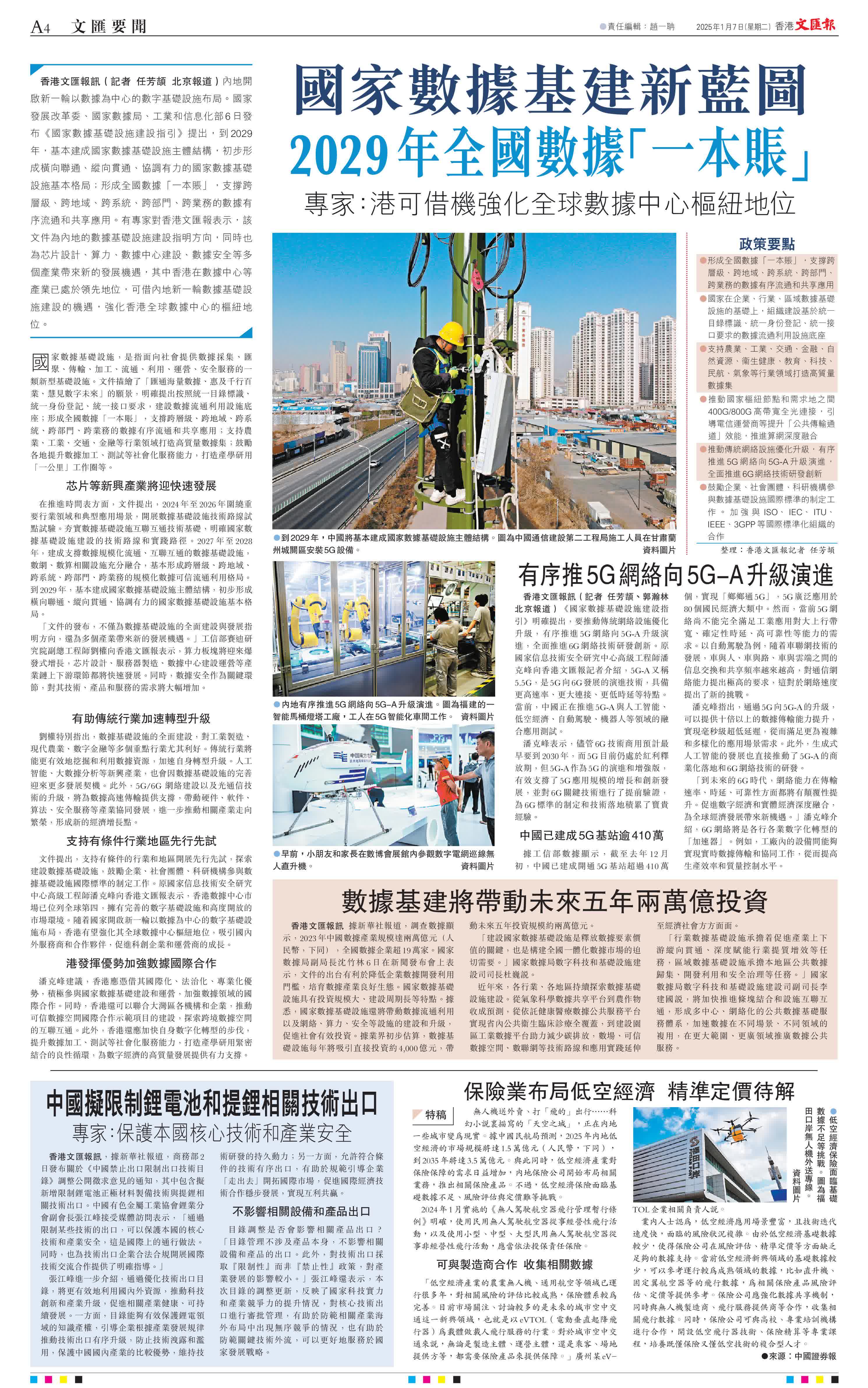 (記者 任芳頡、郭瀚林 北京報道)《國家數據基礎設施建設指引》明確提出,要推動傳統網絡設施優化升級,有序推進5G網絡向5G-A升級演進,全面推進6G網絡技術研發創新。原國家信息技術安全研究中心高級工程師潘克峰向香港文匯報記者介紹,5G-A又稱5.5G,是5G向6G發展的演進技術,具備更高速率、更大連接、更低時延等特點。當前,中國正在推進5G-A與人工智能、低空經濟、自動駕駛、機器人等領域的融合應用測試。