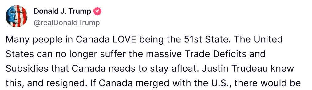 特朗普當天在社交媒體平台「真實社交」上說:「很多加拿大人喜歡成為(美國的)第51個州。美國不能再承受加拿大為維持生存所需的巨額貿易逆差和補貼。特魯多知道這一點,並辭職了。如果加拿大與美國合併,就不會有關稅,稅收會大大降低,他們將完全安全。」