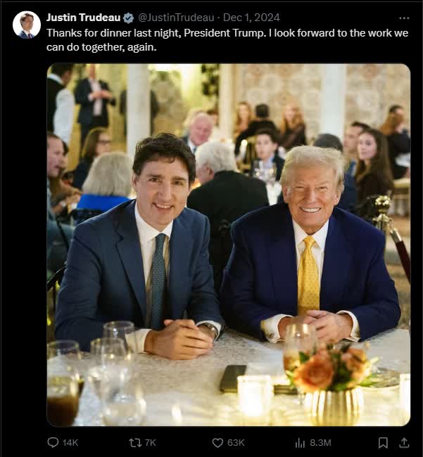 特朗普12月10日在「真實社交」上發文提及這次會面,他說:「前幾天晚上與加拿大州長特魯多共進晚餐,我感到很高興。」「期待很快再次見到州長,這樣我們就可以繼續針對關稅和貿易深入談判,談判結果對所有人而言將是非常了不起的!」