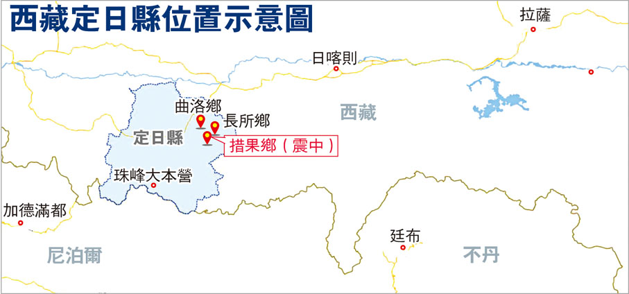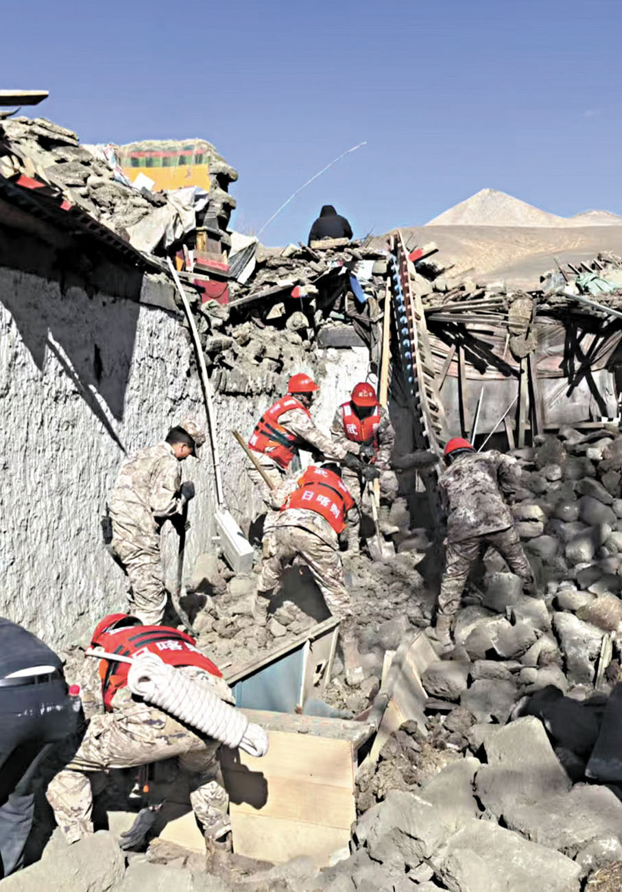 香港文匯報訊 綜合新華社、央視新聞報道,1月7日9時5分,西藏自治區日喀則市定日縣發生6.8級地震,震源深度10公里。定日縣縣城及周邊震感十分明顯,震中位於定日縣措果鄉,附近房屋倒塌嚴重。日喀則市當日晚間發布,經初步排查,截至19時,地震已造成126人遇難、188人受傷,28名重症人員轉移到市人民醫院救治;倒塌房屋3,609戶。地震發生後,中央作出重要指示,要求全力開展人員搜救,最大限度減少傷亡,妥善安置受災群眾,確保安全溫暖過冬。目前,國家地震應急響應升至二級,西藏自治區應急指揮部將地震應急響應升級為一級,國家發展改革委緊急撥款1億元(人民幣,下同,約1.07億港元)支持災後應急,西藏軍區和西部戰區亦迅速組織兵力前往災區救援,西部戰區空軍派出無人機、運—20趕赴災區前線。