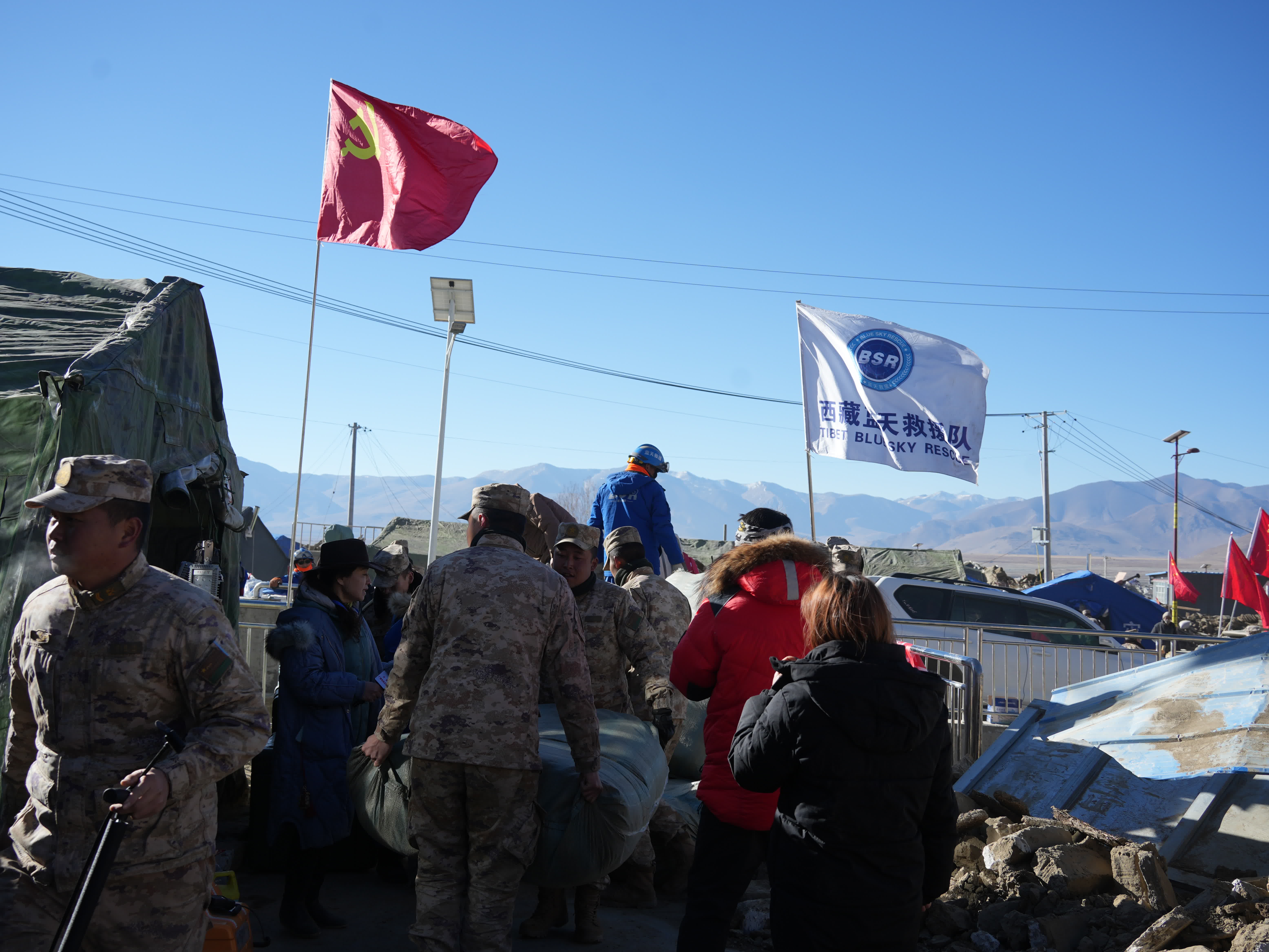 下午13時30分左右,救援隊伍在古榮村原地休整,解放軍、公安、消防、西藏藍天救援隊及其他組織等待指揮部統一部署行動。