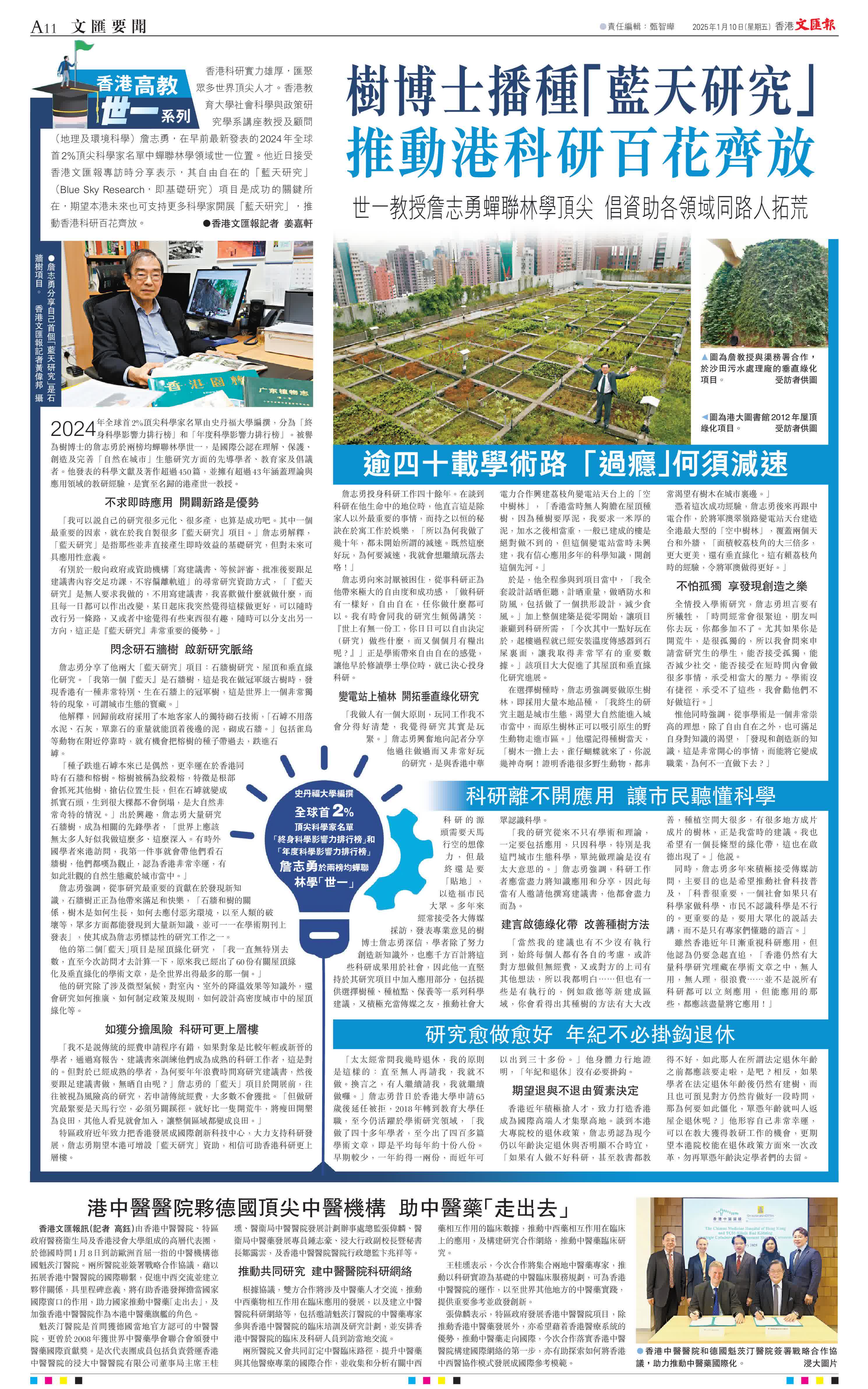 2024年全球首2%頂尖科學家名單由史丹福大學編撰,分為「終身科學影響力排行榜」和「年度科學影響力排行榜」。被譽為樹博士的詹志勇於兩榜均蟬聯林學世一,是國際公認在理解、保護、創造及完善「自然在城市」生態研究方面的先導學者、教育家及倡議者。他發表的科學文獻及著作超過450篇,並擁有超過43年涵蓋理論與應用領域的教研經驗,是實至名歸的港產世一教授。