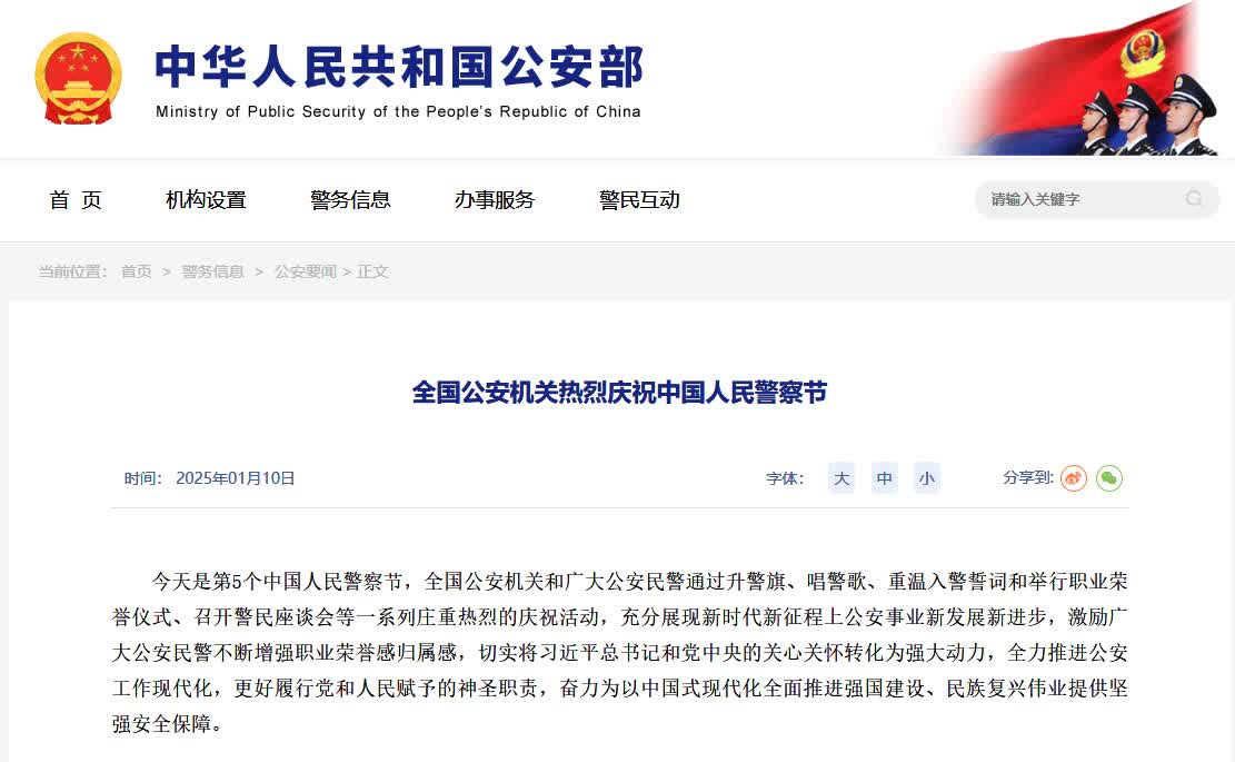 1月10日上午,公安部舉行了莊重的升警旗儀式,300餘名幹部代表整齊列隊,伴隨着中國人民警察警旗冉冉升起,全體人員高唱《中國人民警察警歌》,並向警旗敬禮。升警旗結束後,全體人員面向警旗,高舉右拳,重溫公安機關人民警察誓詞,錚錚誓言響徹現場。當日,公安部還通過召開新聞發布會、開展主題宣傳、聯合推出特別節目、組織融媒體直播、發布優秀公安民警事跡等,集中展示全國公安機關和廣大公安民警強化政治擔當、忠誠履職盡責,為全力維護國家安全和社會穩定、守護人民幸福和安寧作出的新貢獻、取得的新成效。