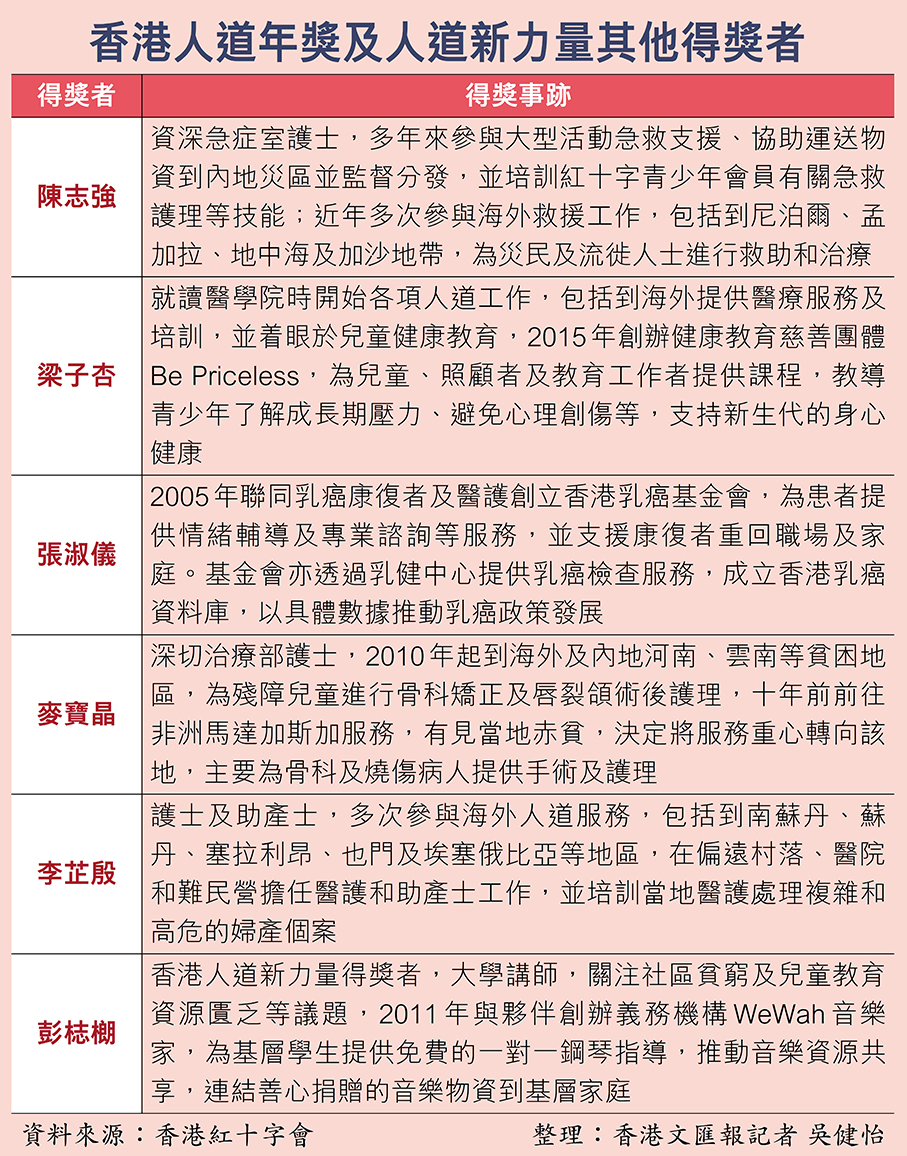 (香港文匯報記者 吳健怡)香港紅十字會昨日舉行香港人道年獎2024頒獎禮,選出7位香港人道年獎及2位香港人道新力量的得獎者。得獎者來自不同行業,包括醫生、護士、大學講師、視障心理治療師及臨床輔導心理學家等。香港首位視障心理治療師及臨床輔導心理學家黃明慧,年幼時失去視力,但未有因而放棄,逆境下自強不息,不但學業有成,更創辦「點字曲奇」品牌,希望公眾對視障人士情況加深了解,又與團隊創辦組織醫藝同行,到內地山區進行義診服務及探訪,提供醫藥和心靈上的支援,令她成為今屆香港人道年獎得獎者之一。