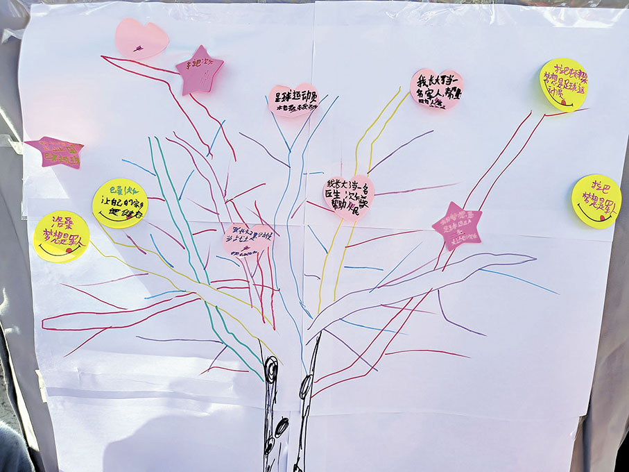 「我們帶了10套畫筆,孩子們選的顏色都是五顏六色的,他們很少去選擇黑色。」宋堯說,孩子們的畫作也反映出他們的心態是五顏六色的,很陽光。孩子們的畫作貼在了帳篷上,一棵「夢想樹」也在成長。「我長大了當一名軍人,幫助人民」「我長大了當一名醫生」「我要把家鄉建設好」……孩子們寫的最多的是軍人、醫生、志願者,站在這棵「夢想樹」前,宋堯被感動了。
