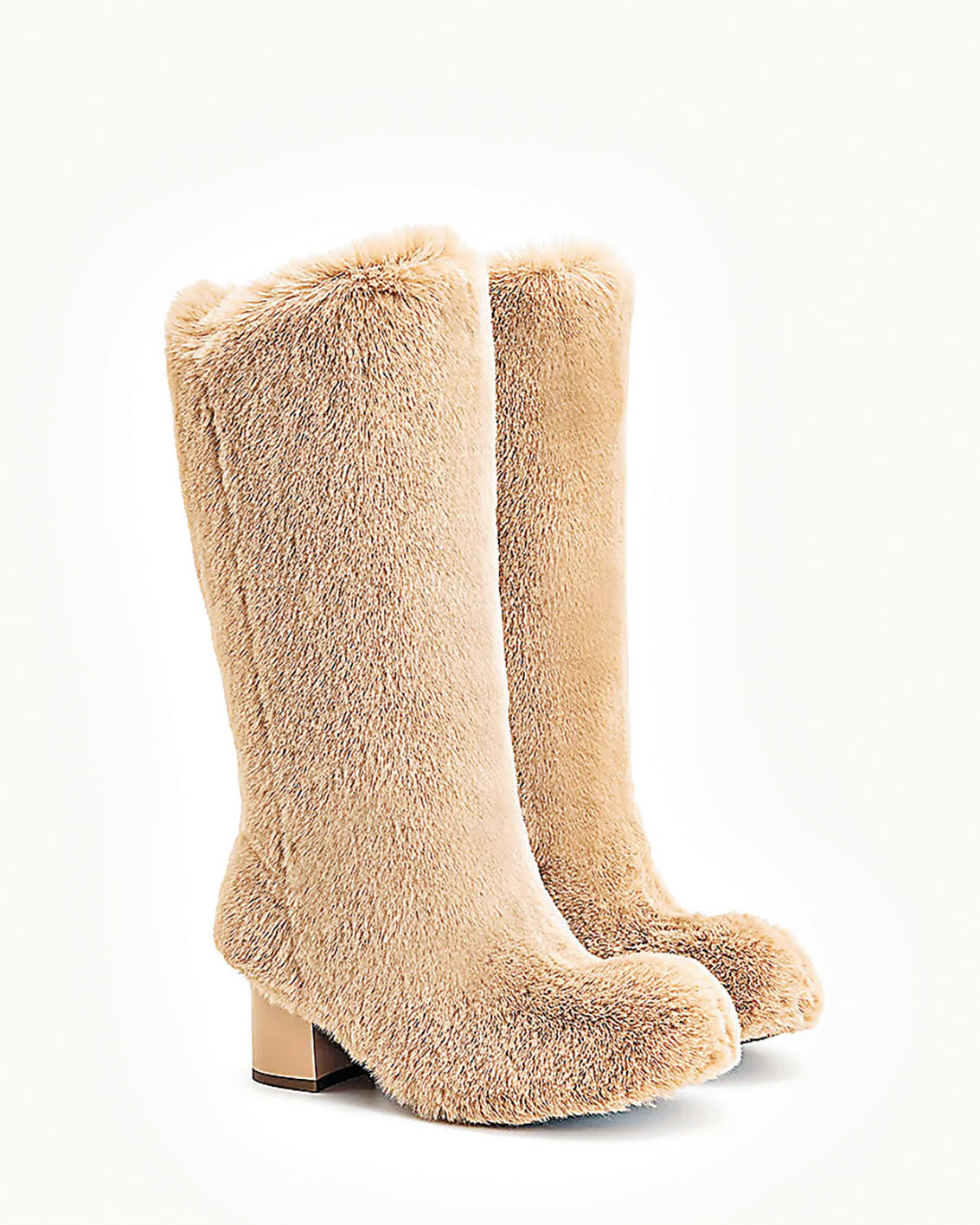 這對米色的毛毛長靴,鞋跟高度有6.5cm,可以拉長腿部線條。加上鞋底材質為橡膠更可防滑。