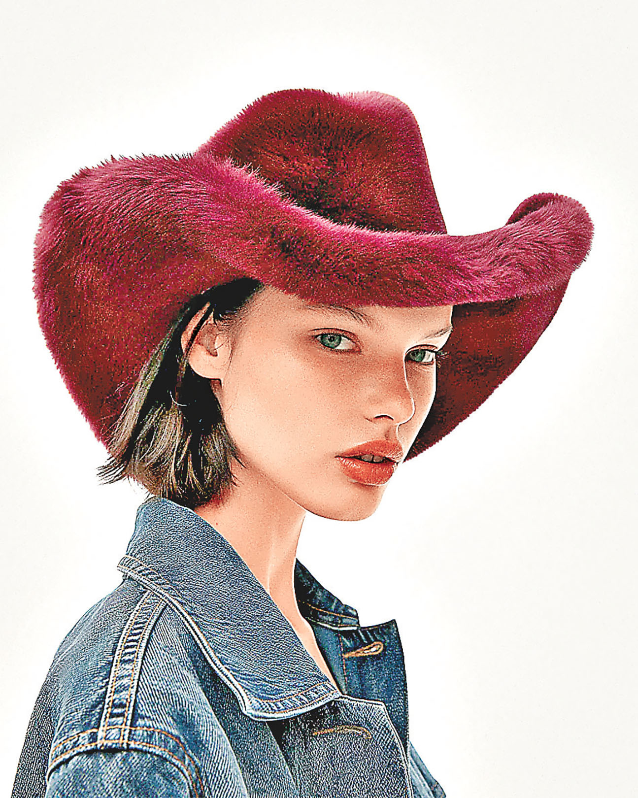 酒紅色的毛毛牛仔帽用上純素的仿毛皮,柔軟溫暖,內襯材質則為棉,頭圍可調節,十分貼心。
