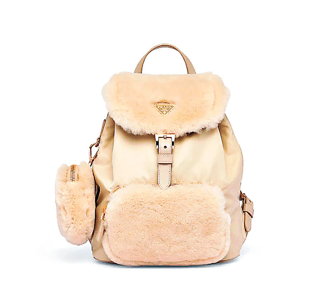 背包採用創新再生尼龍紗線Re-Nylon和羊毛皮革打造,其毛茸茸的外形配上淺米色,高貴得來不失活潑,中和了毛毛材質過於成熟的形象。