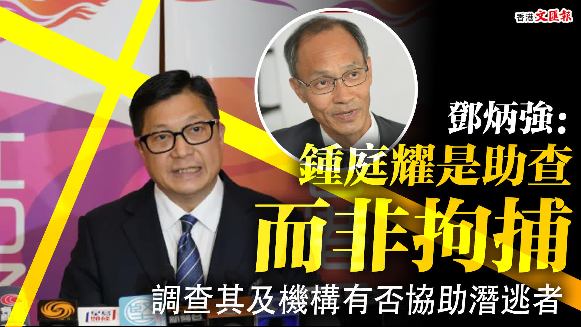 警方國安處今早(13日)到「香港民研」主席及行政總裁鍾庭耀住所及黃竹坑「香港民研」辦公室調查一宗協助在逃人士案件,據悉涉及被通緝的鍾劍華。保安局局長鄧炳強和撲滅罪行委員會委員嚴玉麟今日在委員會會議結束後見記者。鄧炳強表示,鍾庭耀不是被拘捕,而是被帶走協助警方調查。