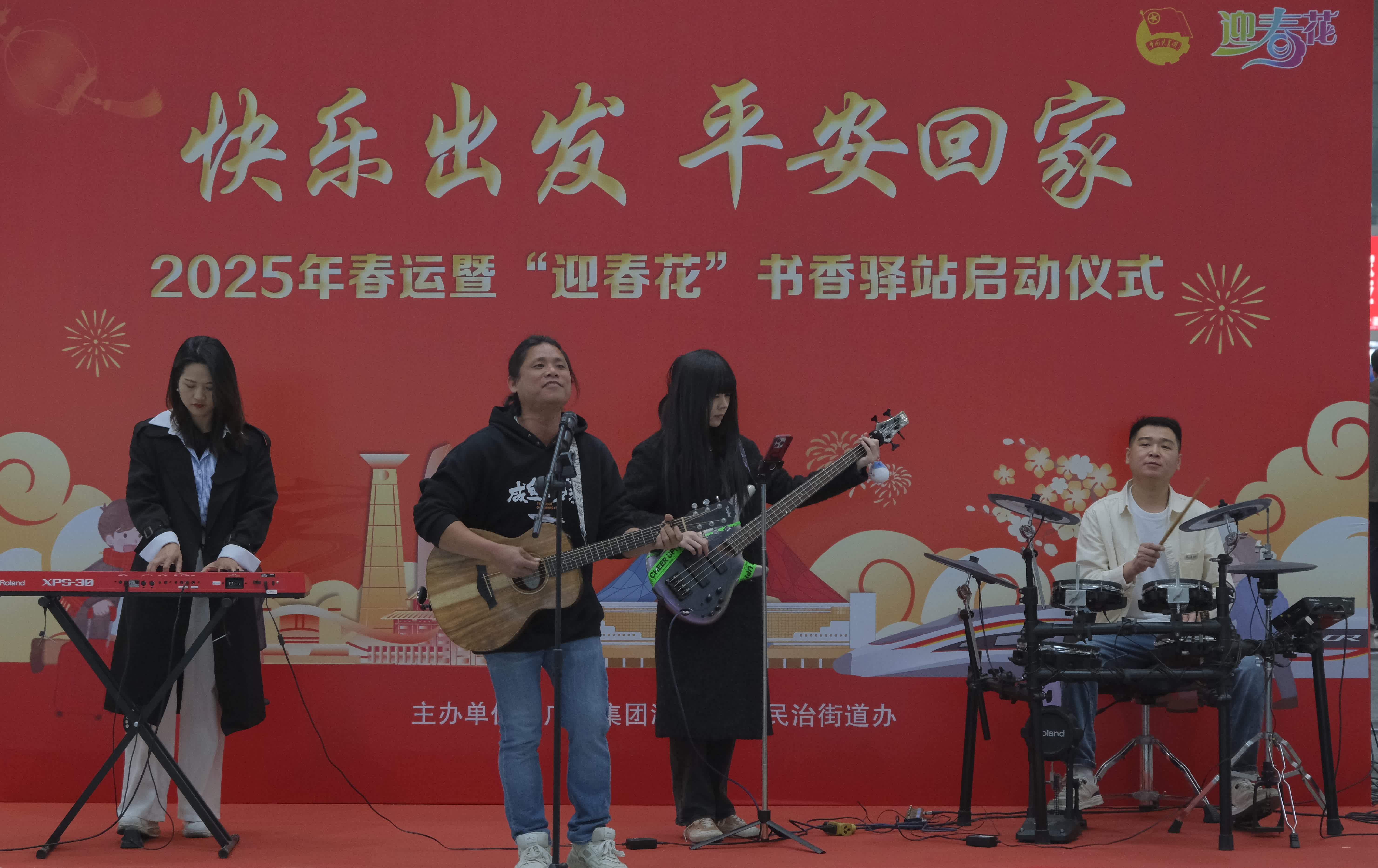 在候車大廳的另一側,「送福」活動也在如火如荼地進行着。深圳北站特邀書法家們筆走龍蛇,力透紙背,一幅幅寓意吉祥的對聯和「福」字躍然紙上。身着統一制服的「迎春花」服務隊員們緊隨其後,伴隨着歡快的旋律,在候車大廳中央翩翩起舞,為旅客們送上新春的美好祝願。緊接着,學生藝術團登台獻唱,他們的歌聲清脆悅耳,充滿了青春的活力與朝氣。隨後,樂隊的歌曲串燒更是將現場氣氛推向了高潮,動感的旋律、激情的演唱,引得旅客們紛紛駐足觀賞,拍照留念。歌曲串燒結束後,工作人員一同進行了集體宣誓,共同表達了對新年的美好祝願和對祖國的熱愛之情。