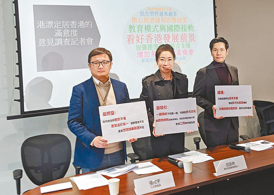 立法會議員張欣宇、吳傑莊上月與青年港漂總會合作進行港漂定居香港滿意度調查,訪問近800名港漂,發現有52%受訪者在港工作,其餘48%仍在求學,約一半正修讀學士或碩士課程。
