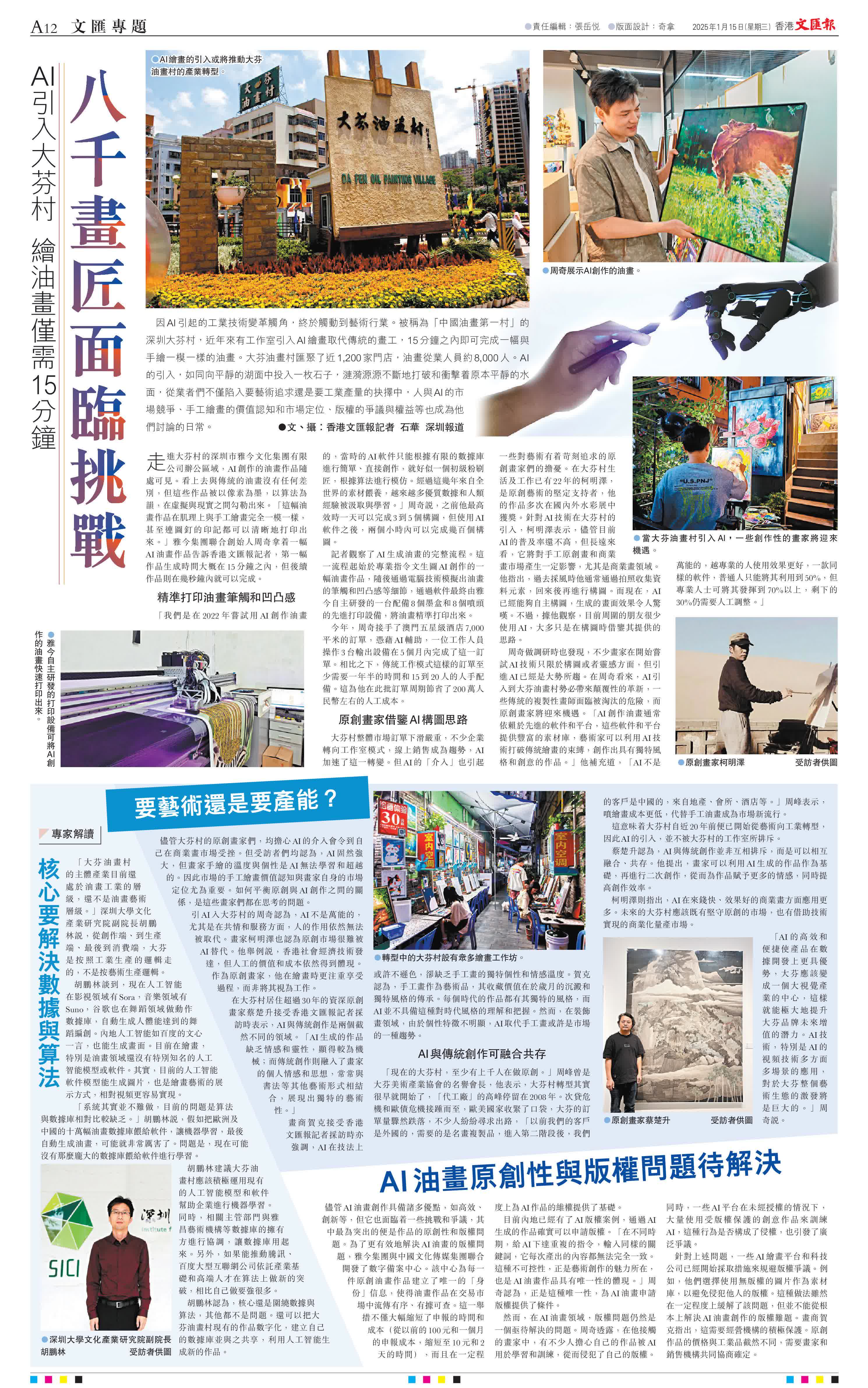 (香港文匯報記者 石華 深圳報道)因AI引起的工業技術變革觸角,終於觸動到藝術行業。被稱為「中國油畫第一村」的深圳大芬村,近年來有工作室引入AI繪畫取代傳統的畫工,15分鐘之內即可完成一幅與手繪一模一樣的油畫。大芬油畫村匯聚了近1,200家門店,油畫從業人員約8,000人。AI的引入,如同向平靜的湖面中投入一枚石子,漣漪源源不斷地打破和衝擊着原本平靜的水面,從業者們不僅陷入要藝術追求還是要工業產量的抉擇中,人與AI的市場競爭、手工繪畫的價值認知和市場定位、版權的爭議與權益等也成為他們討論的日常。