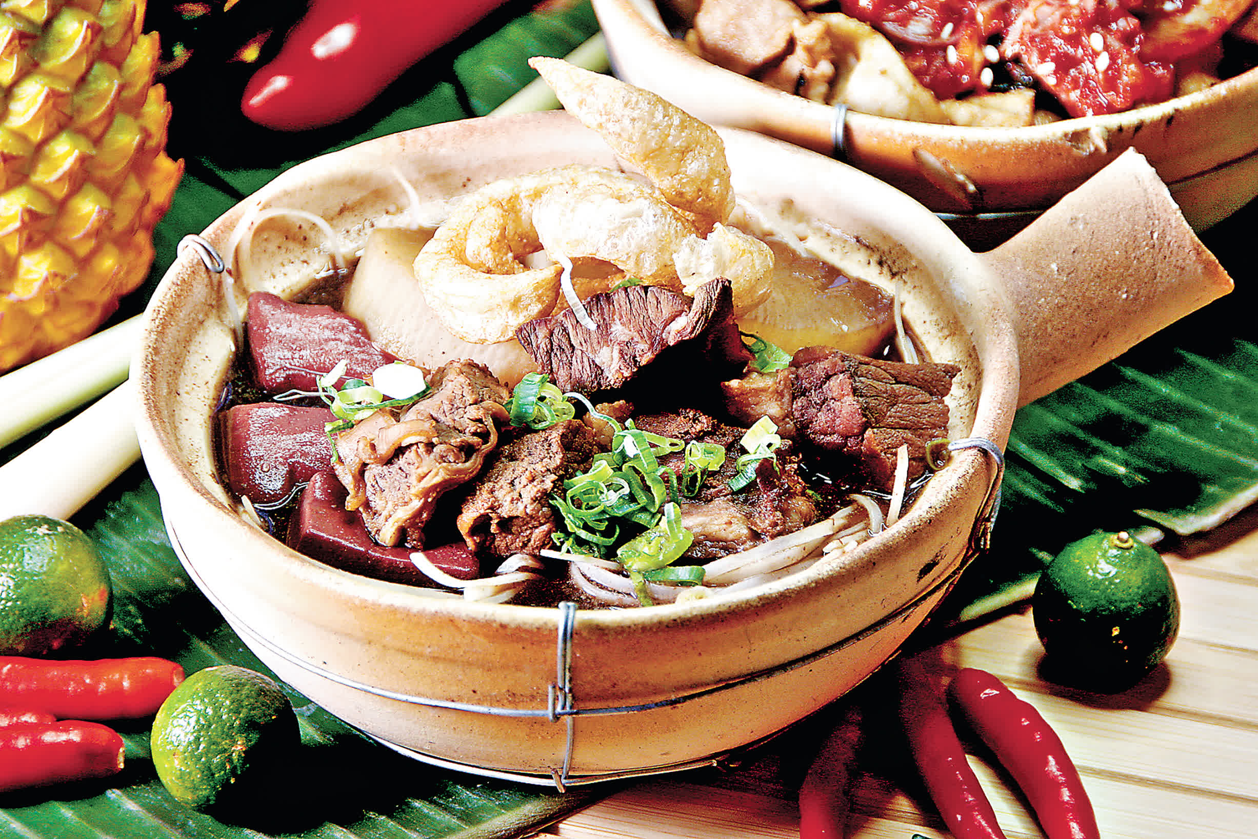 另外,新火鍋套餐分為A/B/C 3個級別,定價由168元至338元不等,最多可品嘗逾100款配料及美食。A餐以火鍋為主,B餐及C餐則會採用全新食法。先自選前菜3選1,包括好鮮嫩灸烤魚煲、激濃郁麻辣醬雞煲或創意特色菜如泰檸開胃手抓雞撈起,品嘗前菜後就可自選湯底轉食火鍋。湯底方面,觀塘店共有8款選擇,泰式口味的包括泰金冬蔭功鍋、檸檬香茅鍋、馬來娘惹叻沙鍋、泰麻辣鍋,也有其他特色口味如關東煮壽喜燒鍋、青檸椰奶雞湯鍋、日式番茄濃湯鍋、藥膳豬骨白湯鍋。當中首選為招牌泰金冬蔭功鍋及檸檬香茅鍋,前者以主廚按自家食譜熬製,加入多款泰國地道香料,味道濃郁酸香,非常惹味;後者以新鮮香茅打碎加入高湯及檸檬葉製成,湯底色澤清澈,清香甘甜,正好中和肉類的油膩感。