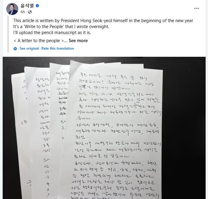 此後不久,尹錫悅的社交平台賬號發布了其手寫信照片,並配文稱,這是尹錫悅在新年伊始親自撰寫的文章,是「致國民的一封信」。據悉,手稿原文約有9000字。