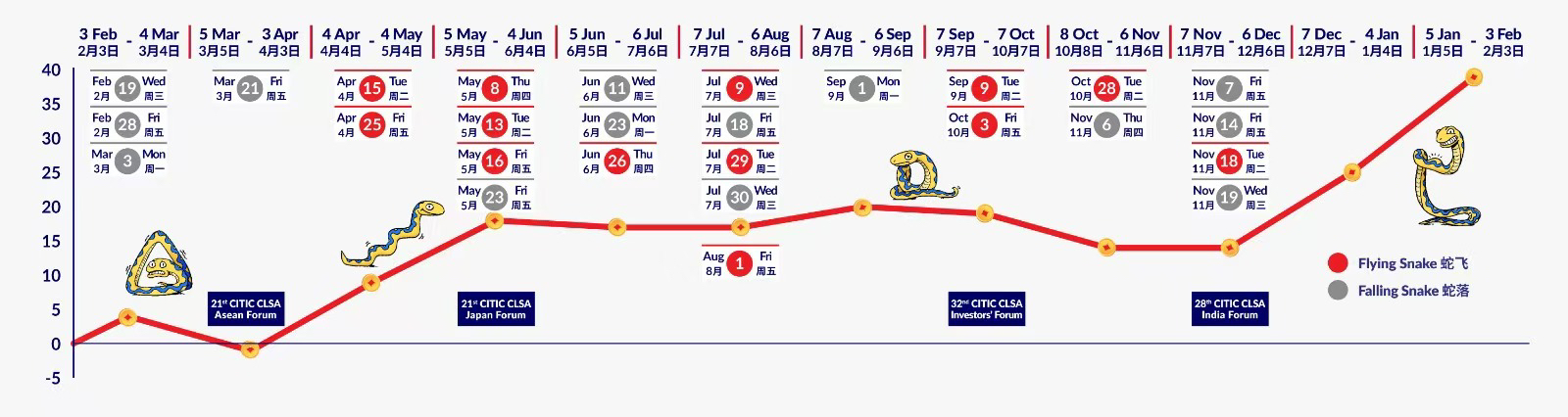 該行從風水術數角度出發,預計2025年2至5月恒指將反覆向上,惟「第6個月就如在岩石上曬太陽的一條懶蛇,恒生指數停滯」,料6至12月恒指將持續「牛皮」,走勢淡靜,形容「春冬兩季市場預期漲勢良好,漫長夏日低迷無力」,不過12月後至年底2月則反彈向上。該行指乙巳蛇年為木蛇年,並以「杯弓蛇影」形容蛇年市況,指市場「疑心過盛」,對於經歷了龍行動盪、渴望尋求安寧未來的人意義深遠。該行敦促投資者時時保持警惕,但不要讓毫無根據的恐懼阻礙前進步伐。