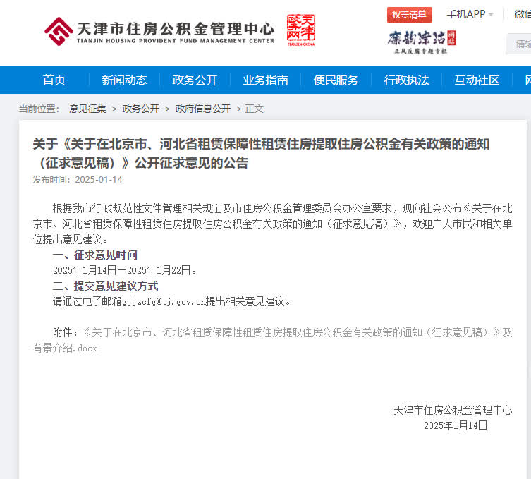 1月14日,天津市住房公積金管理中心網站發布關於《關於在北京市、河北省租賃保障性租賃住房提取住房公積金有關政策的通知(徵求意見稿)》公開徵求意見的公告,擬規定: