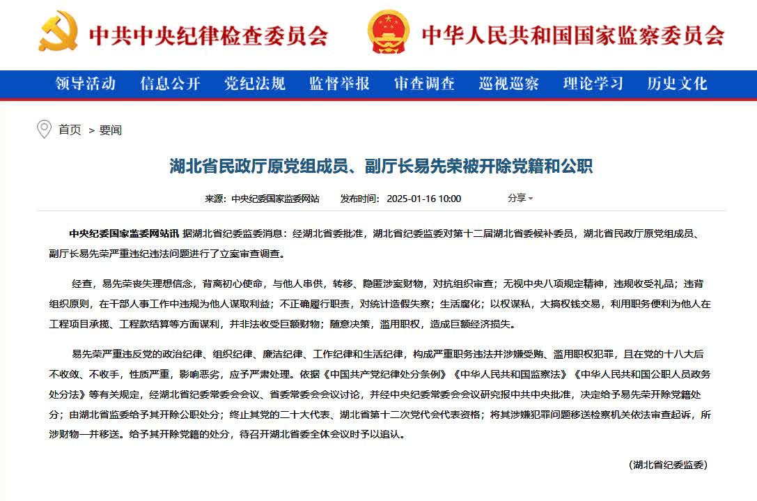 據湖北省紀委監委消息:經湖北省委批准,湖北省紀委監委對第十二屆湖北省委候補委員,湖北省民政廳原黨組成員、副廳長易先榮嚴重違紀違法問題進行了立案審查調查。