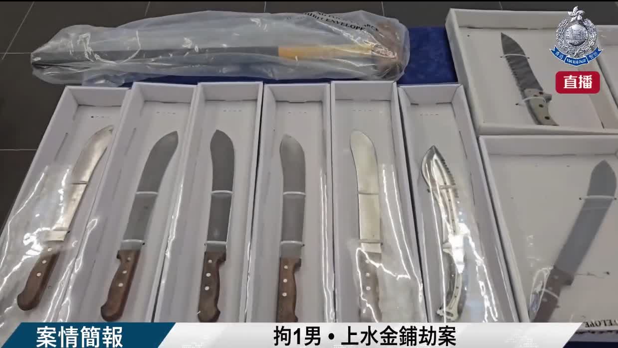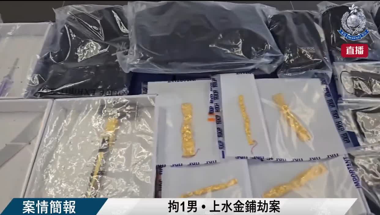 警方指,案發昨日傍晚,上水一間金舖遭4名蒙面人搶劫,賊人用鐵錘打爛金舖櫥窗及飾柜,並用利刀指嚇店員,之後在金舖大肆搶掠,案發期間盜取總值超過150萬元金飾。賊人得手後登上接應私家車向錦田方向逃去。警方續指,涉事私家車在林錦公路同另一輛私家車相撞,賊人落車逃去無蹤,車上遺下作案時利用的利刀及鐵錘,人員經搜索後在附近山邊找到賊人遺下的衣物及口罩。事故中一名無辜男司機受傷,報稱頸部受傷,須留院治理。