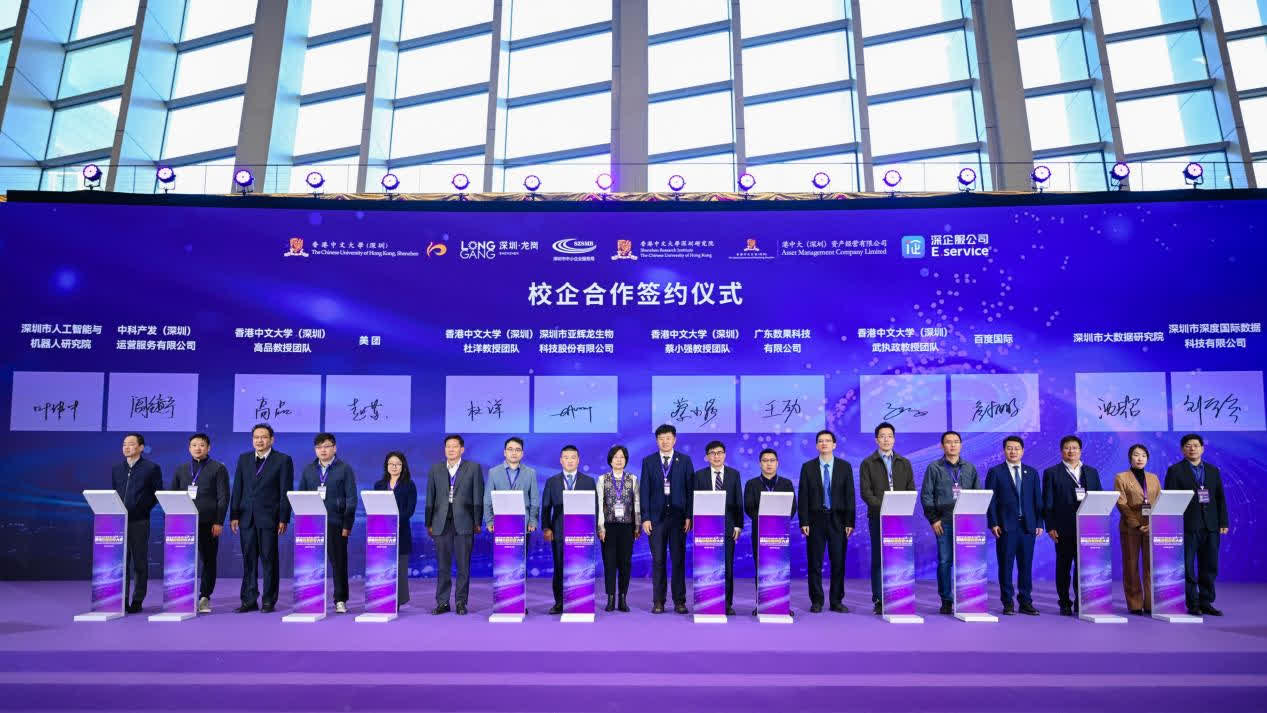 現場還同步舉辦了科技共贏新程--工研產服與深圳市龍崗區城投產業發展運營有限公司、廣州市市政工程維修處有限公司、廣東好邦石墨烯新材料科技有限公司、深圳鼎智達表計信息科技有限公司、深圳市贔玄閣科技有限公司5家企業以及港中大(深圳)資產經營有限公司合作簽約,香港中文大學(深圳)與廣東數果科技有限公司、深圳市亞輝龍生物科技股份有限公司、百度國際科技(深圳)有限公司、漢海信息技術(上海)有限公司(美團)、深圳市深度國際數據科技有限公司、中科產發(深圳)運營服務有限公司6家企業的校企合作簽約,香港中文大學(深圳)與貴州省工商業聯合會簽約,「香港中文大學(深圳)-正宏儲能碳中和技術聯合實驗室」、「香港中文大學(深圳)-豐盛科技-光明人民醫院腦神經信息醫學轉化實驗室」、「中國證券報-香港中文大學(深圳)-深圳數據經濟研究院金牛資產管理研究中心」3家校企聯合實驗室或聯合研究中心揭牌等儀式,加快推動產學研深度合作,促進創新創業項目落地,打造高質量發展的新引擎。
