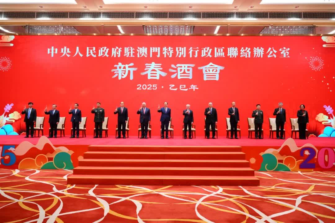1月16日下午,中央政府駐澳門聯絡辦公室舉辦2025年新春酒會。受國務院港澳事務辦公室主任夏寶龍委託,國務院港澳事務辦公室副主任、中央政府駐澳門聯絡辦公室主任鄭新聰出席並致辭,代表夏寶龍主任、國務院港澳事務辦公室和中央政府駐澳門聯絡辦公室向澳門同胞致以新春祝福。澳門特別行政區行政長官岑浩輝出席並致辭,全國政協副主席何厚鏵,前行政長官崔世安、賀一誠,外交部駐澳門特派員公署特派員劉顯法,解放軍駐澳門部隊司令員於長江、政委林慶華,中央政府駐澳門聯絡辦公室副主任黃柳權、呂玉印、張應傑,以及特別行政區政府主要官員,特別行政區立法、司法機構主要負責人,澳區全國人大代表、全國政協委員,特別行政區行政會委員、立法會議員,以及澳門社會各界代表人士1200餘人出席酒會。