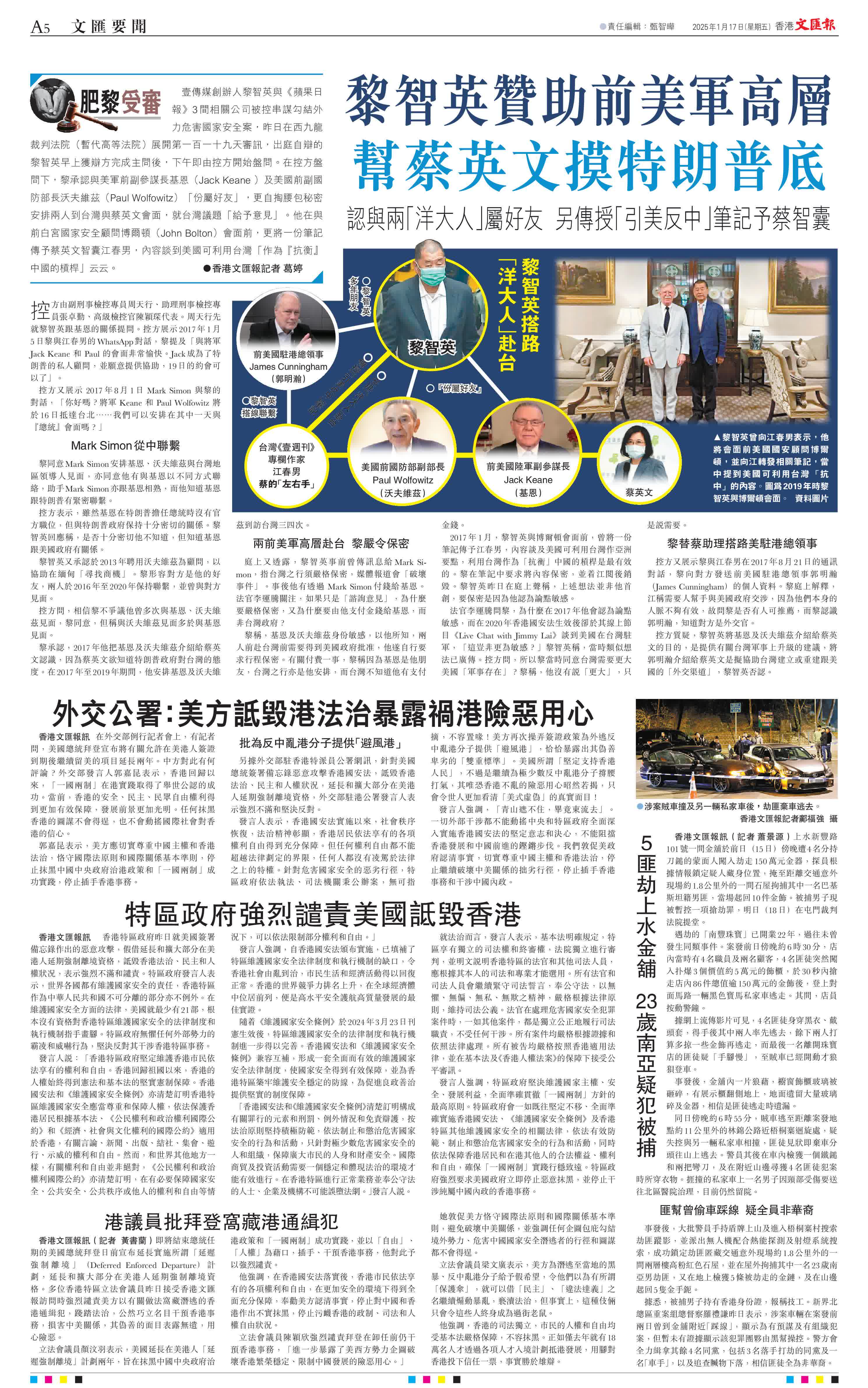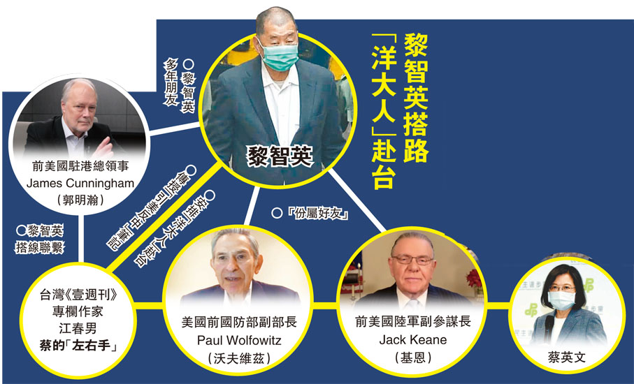 (香港文匯報記者 葛婷)壹傳媒創辦人黎智英與《蘋果日報》3間相關公司被控串謀勾結外力危害國家安全案,昨日在西九龍裁判法院(暫代高等法院)展開第一百一十九天審訊,出庭自辯的黎智英早上獲辯方完成主問後,下午即由控方開始盤問。在控方盤問下,黎承認與美軍前副參謀長基恩(Jack Keane )及美國前副國防部長沃夫維茲(Paul Wolfowitz)「份屬好友」,更自掏腰包秘密安排兩人到台灣與蔡英文會面,就台灣議題「給予意見」。他在與前白宮國家安全顧問博爾頓(John Bolton)會面前,更將一份筆記傳予蔡英文智囊江春男,內容談到美國可利用台灣「作為『抗衡』中國的槓桿」云云。