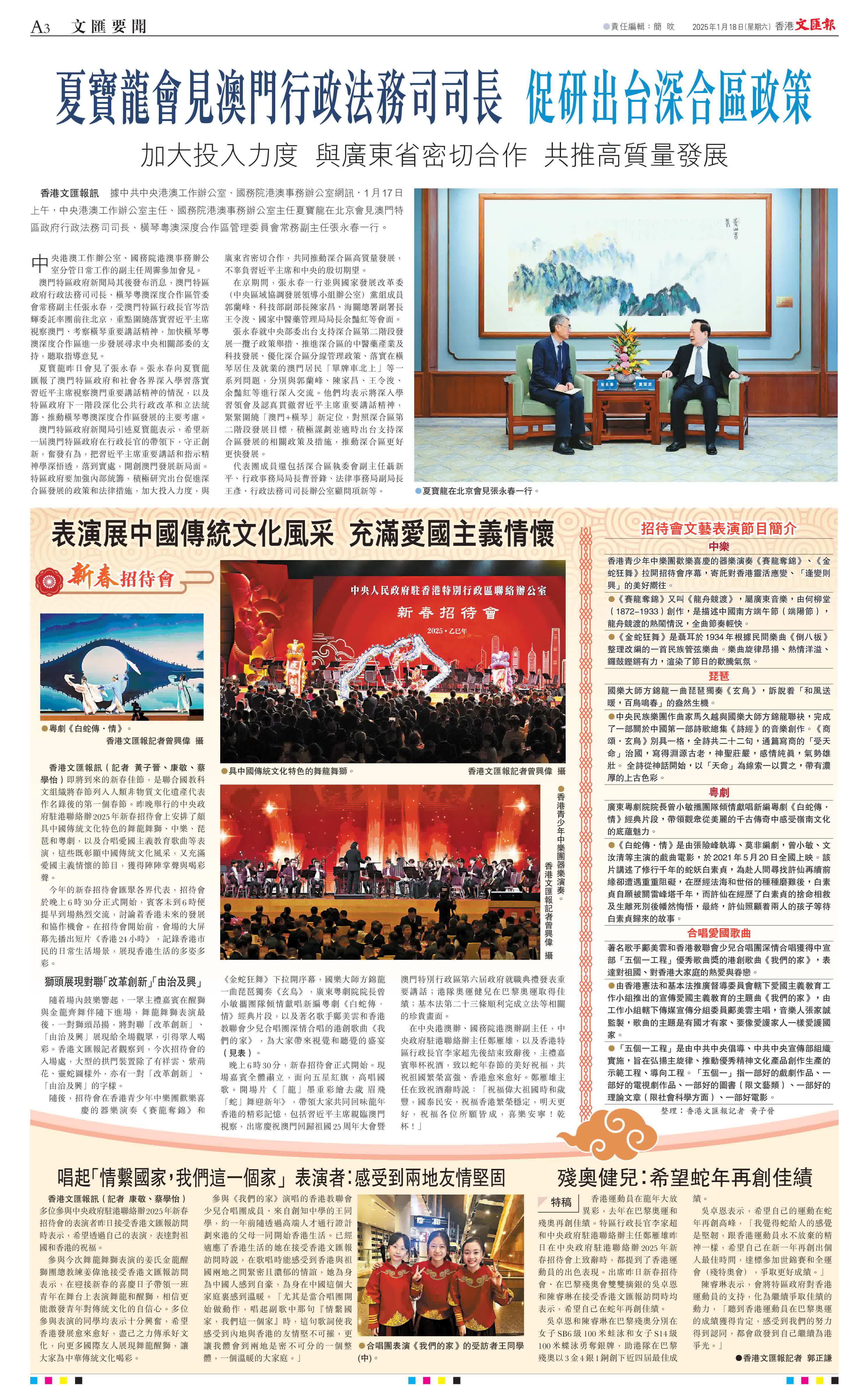 香港文匯報訊 據中共中央港澳工作辦公室、國務院港澳事務辦公室網訊,1月17日上午,中央港澳工作辦公室主任、國務院港澳事務辦公室主任夏寶龍在北京會見澳門特區政府行政法務司司長、橫琴粵澳深度合作區管理委員會常務副主任張永春一行。